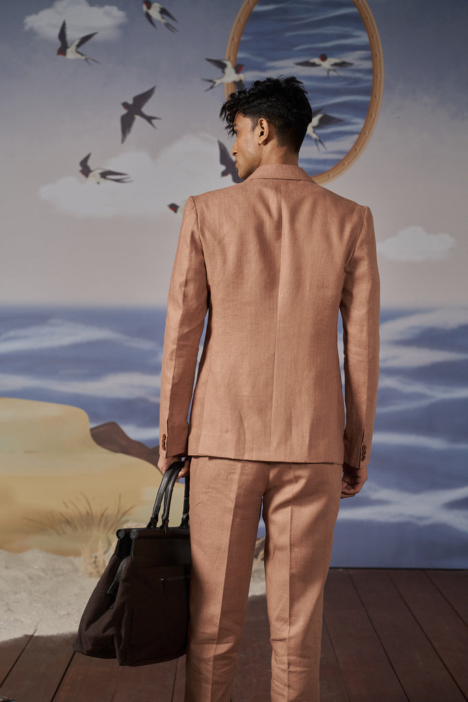 Washed in the hues of soft faded rust, this suit redefines relaxed tailoring. The blazer’s pintuck patch pocket adds crafted detail, while turn-up hem pants bring a casual, confident edge. An effortless blend of earthiness and modern design for everyday workwear and casual gathering.