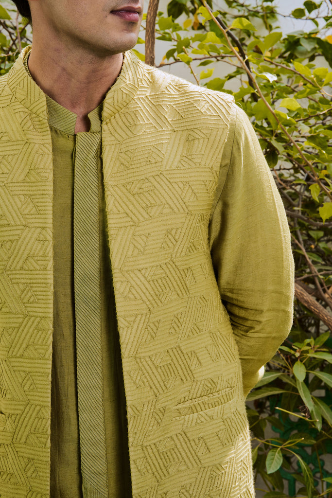 This light green set, with its unique fray embroidery on the bandi as well as a meticulously crafted kurta with pintucks on the placket and collar and fray embroidery on the cuffs to tie the whole outfit together, captures the essence of new life, like a tender leaf unfurling in the forest.