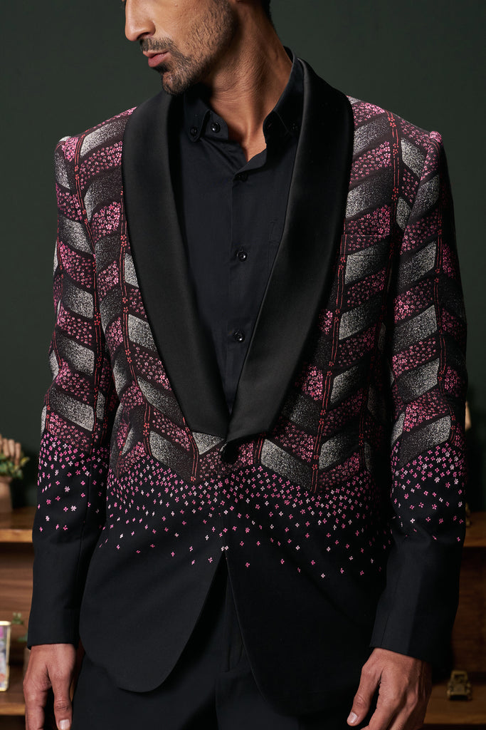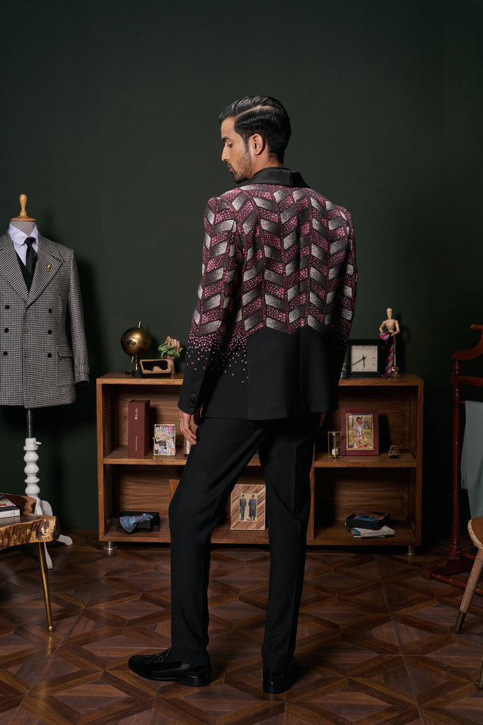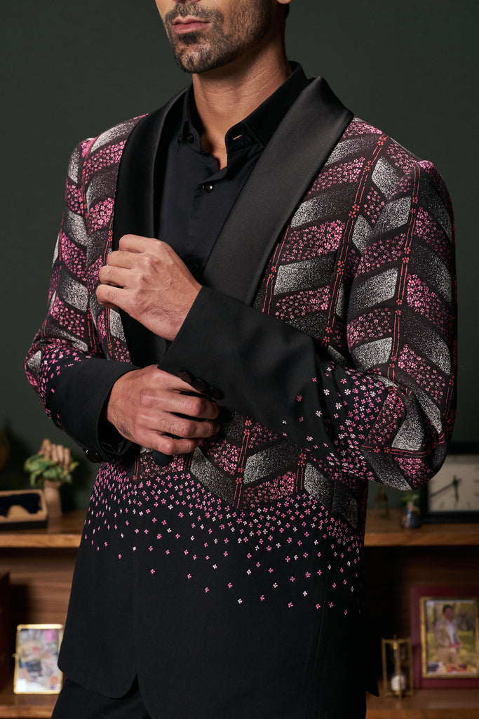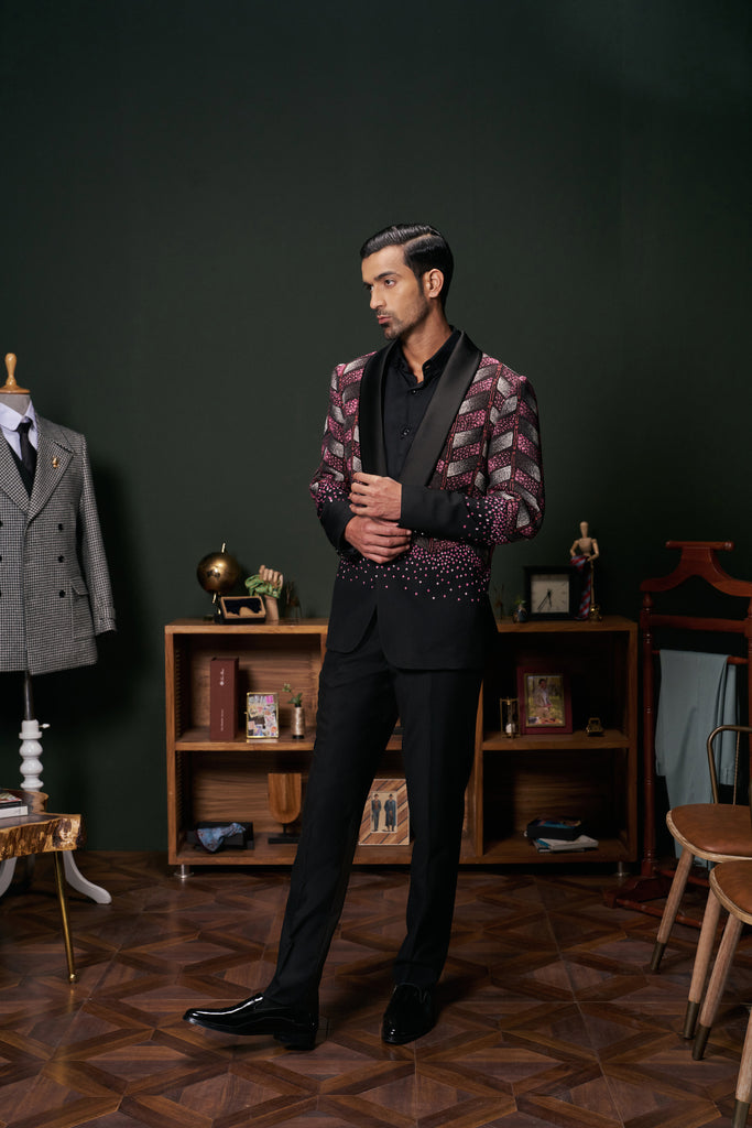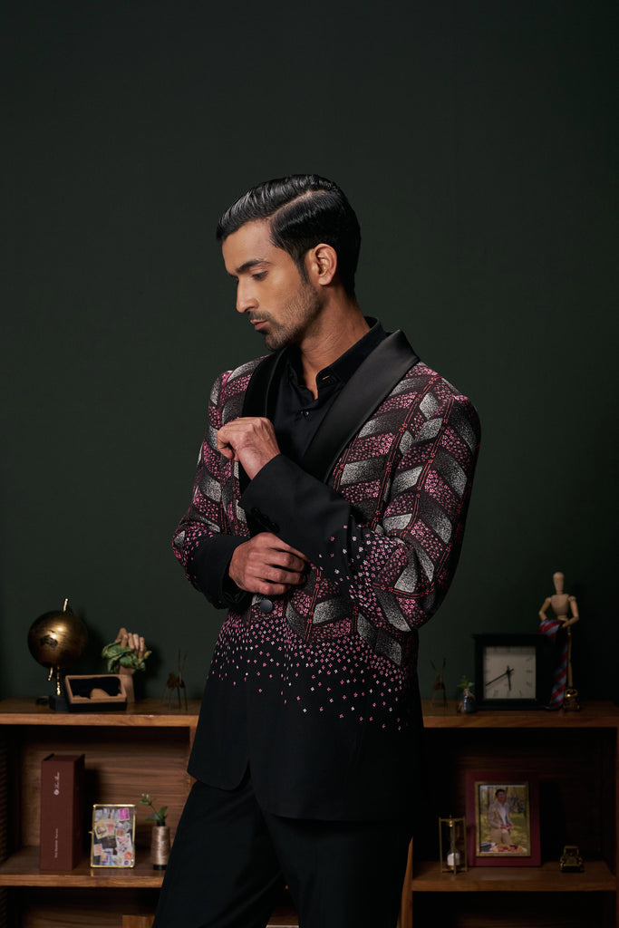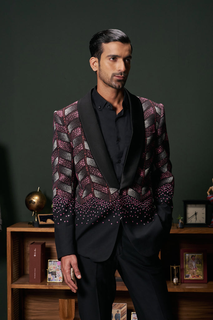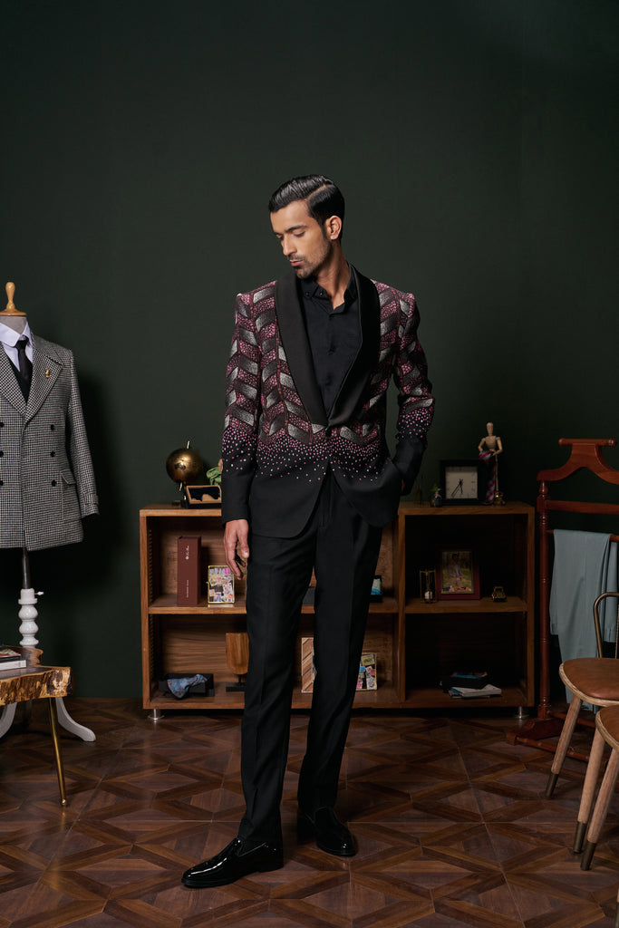 The Anthos tuxedo seamlessly blends classic black with vibrant floral embroidery, featuring a shawl collar and chevron patterns extending from the upper torso to the elbows. This sophisticated design offers a modern twist on traditional formalwear, making it suitable for both formal and semi-formal occasions.