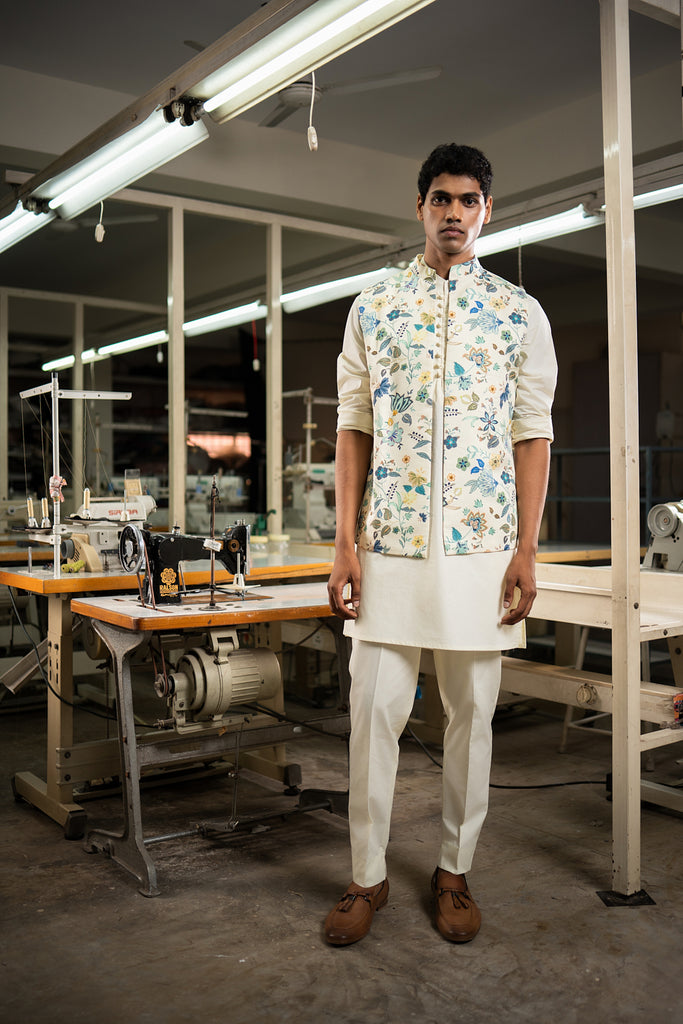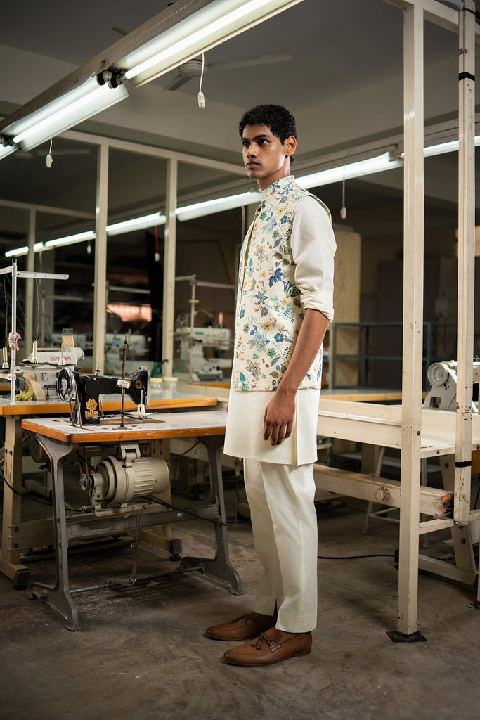 Build your Indian wardrobe with this timeless set featuring a printed linen satin bandi paired with a classic cotton kurta pajama. The bandi showcases a buttonless, open-style silhouette with a mandarin collar and a concealed inner pocket for added functionality. The kurta features potli buttons, cuffed sleeves, complemented by two practical hip pockets. The trouser style pajama features an elasticated back, zip and fly front closure, and two hip pockets. The pajama is cut to a slim fit and has ankle slits for ease of wear. Together, they create a polished, formal look that can be effortlessly deconstructed for versatile styling in the future.