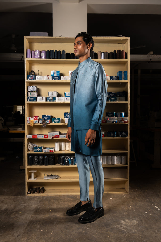 BLUE YAARA OPEN BANDI WITH MATCHING KURTA PAJAMA SET – Curato