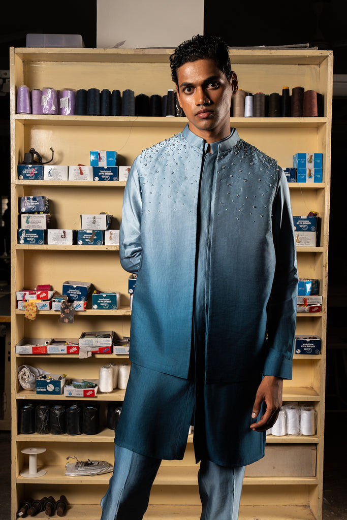 The Yaara Bandi Set is a celebration of understated modern elegance. The kurta pajama and bandi are all crafted from luxurious linen satin, dyed with a rich gradient ombre that adds depth and dimension to its monochromatic look. The bandi is hand-embroidered with a combinations beads and clear crystal chips, giving it a “dripped in ice” effect.