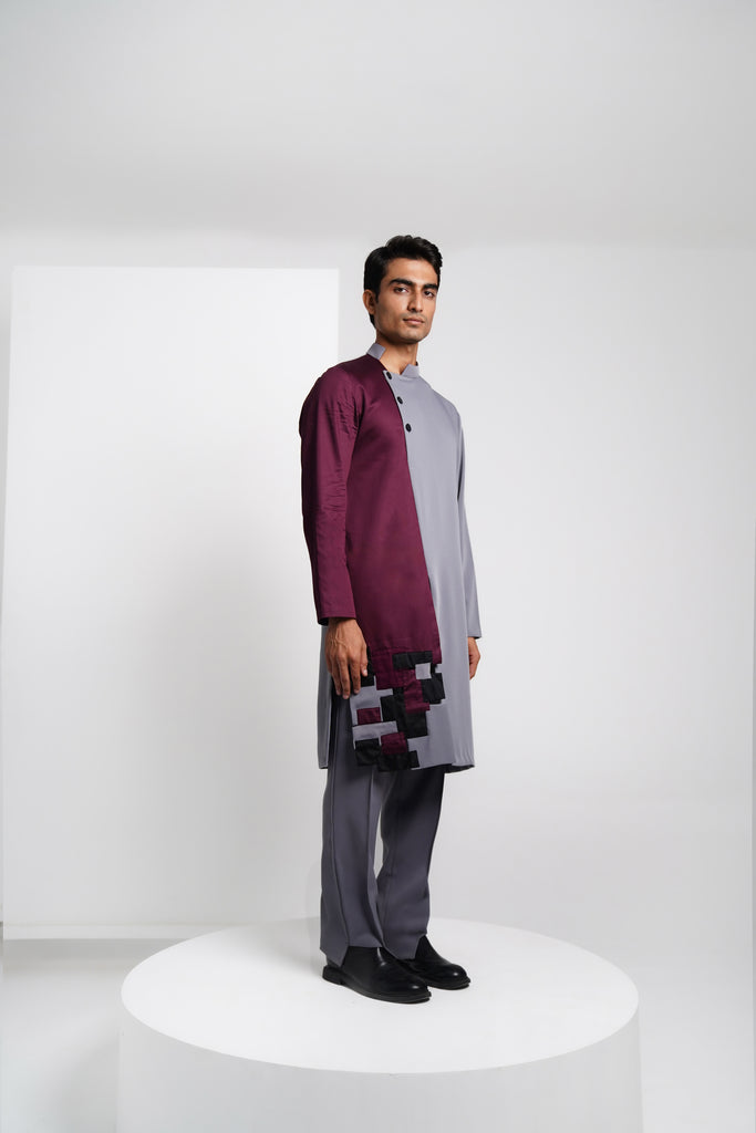 - Contemporary kurta crafted in a striking two-tone palette of Wine and soft grey.- Unique asymmetric design - Mandarin collar with an off-center button placket.- Intricate patchwork detail at the hemline on one side- Pair with coordinating grey trousers- Wear to festive occasions, weddings, or evening celebrations