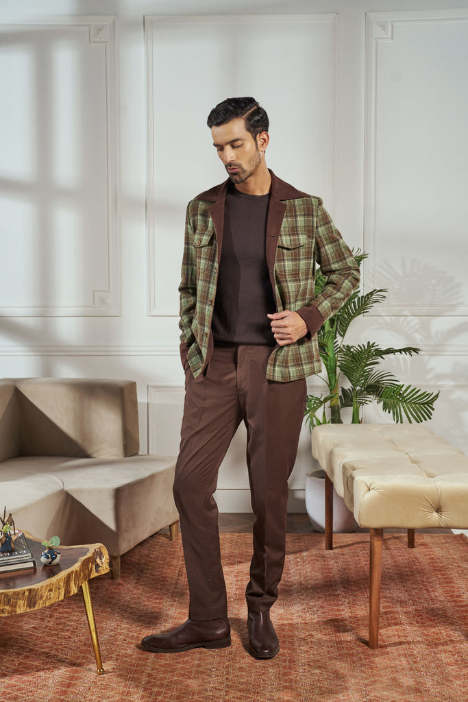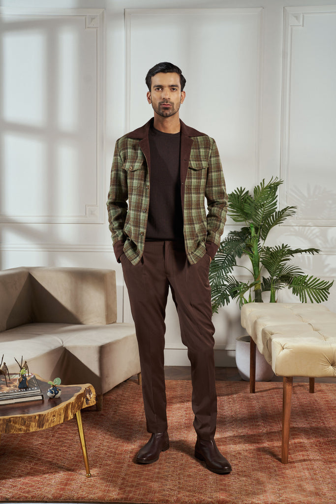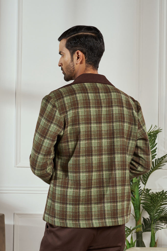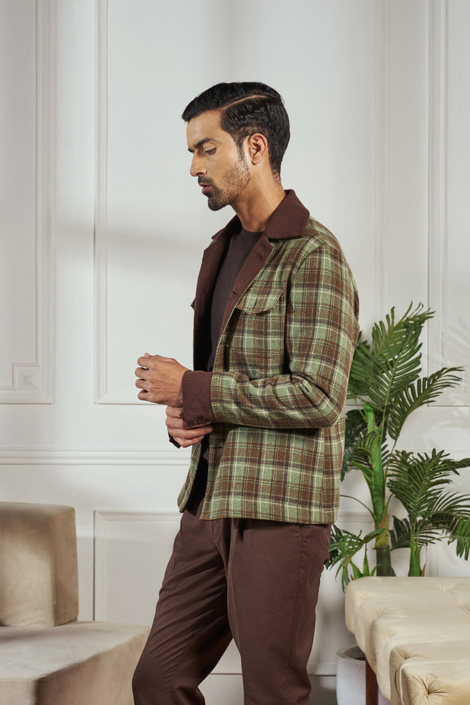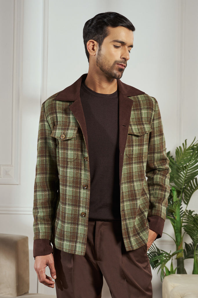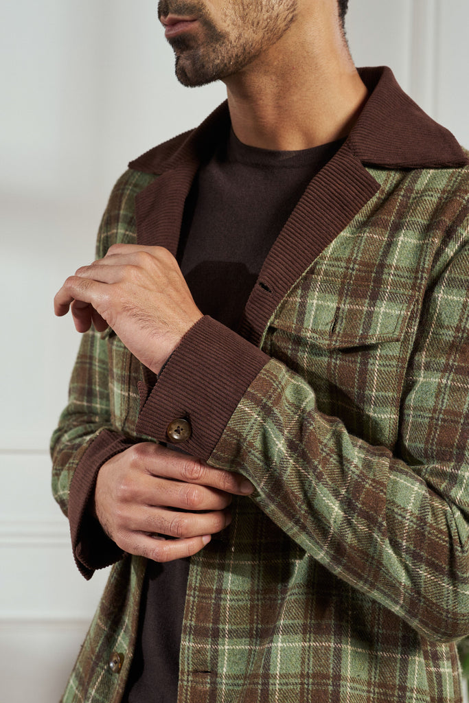 The Briar shacket seamlessly blends the casual comfort of a shirt with the structure of a jacket. Crafted from a green and brown checkered woolen fabric, it features corduroy detailing on the collar, facing, and sleeve cuffs, adding a touch of sophistication to its rugged design. Perfect for winter wear, this versatile piece offers both style and functionality, making it an essential addition to any wardrobe.