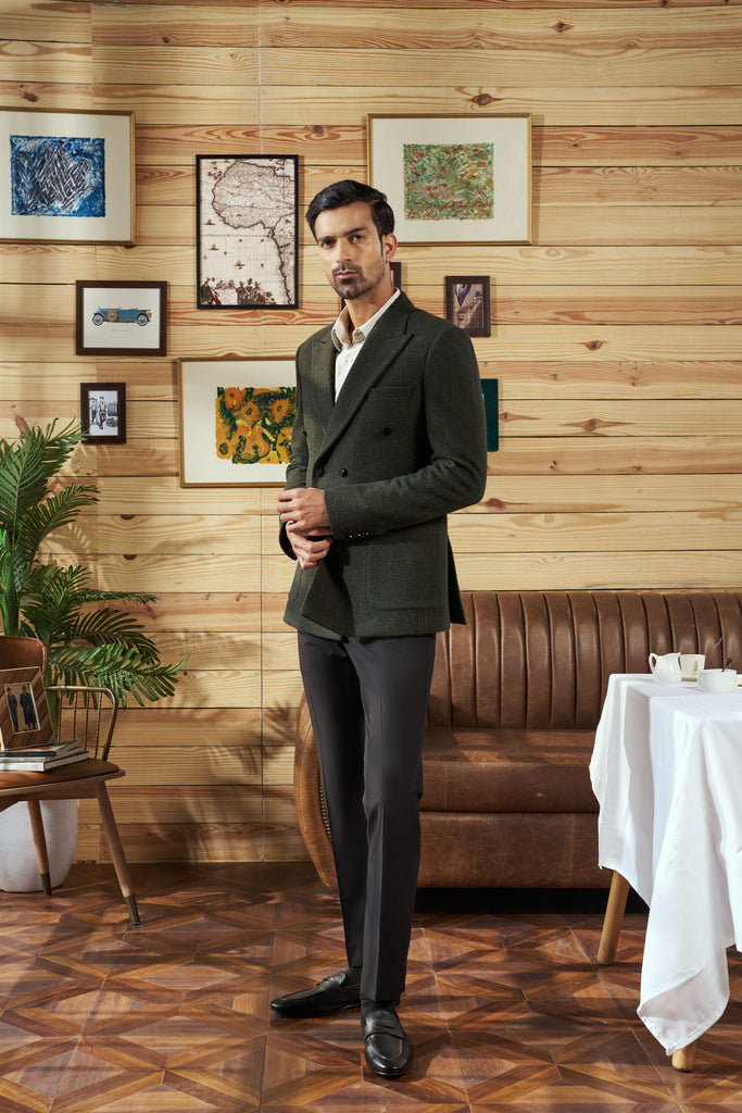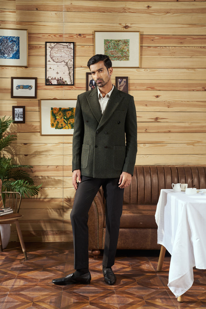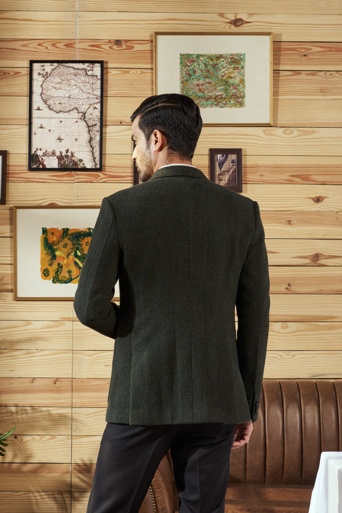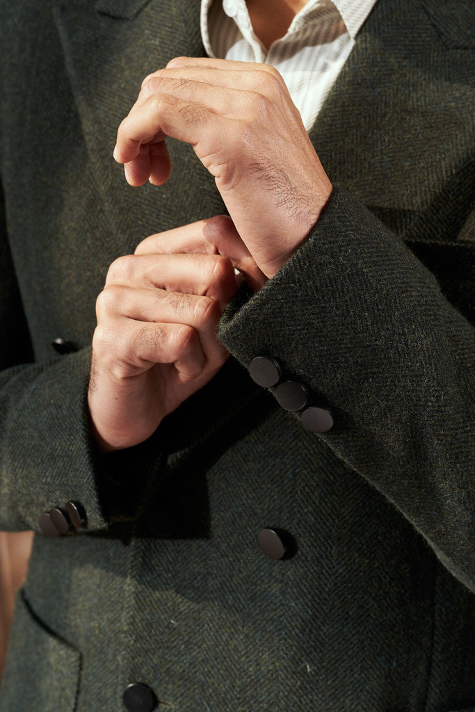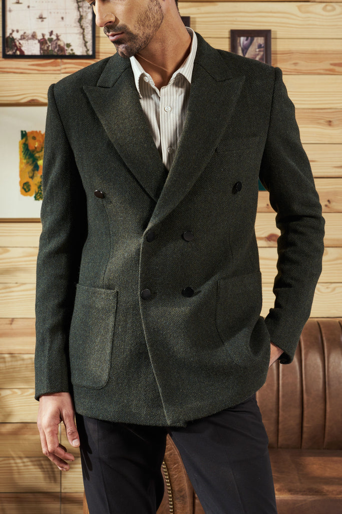 The Brillo jacket is a statement of winter sophistication, combining the deep green richness of forest hues with the timeless appeal of herringbone wool. The double-breasted design with peak lapels and patch pockets offers classic styling, while the luxurious wool provides warmth and comfort. A perfect fusion of tradition and modernity, this jacket is ideal for colder months, delivering both refined elegance and lasting durability.