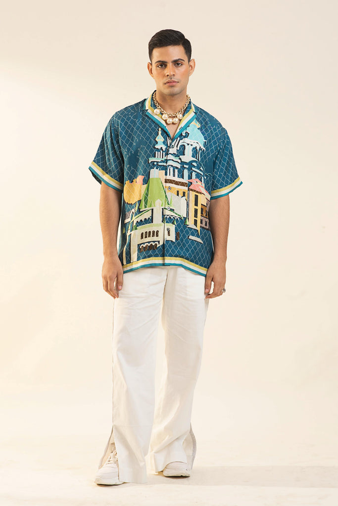Digitally printed Teal shirt on 100% Silk with relaxed fit, camp collar, half sleeves and shell buttons. Artwork inspired from the St. Andrews Church Kiev, Ukraine with Dark Hour logo on back.