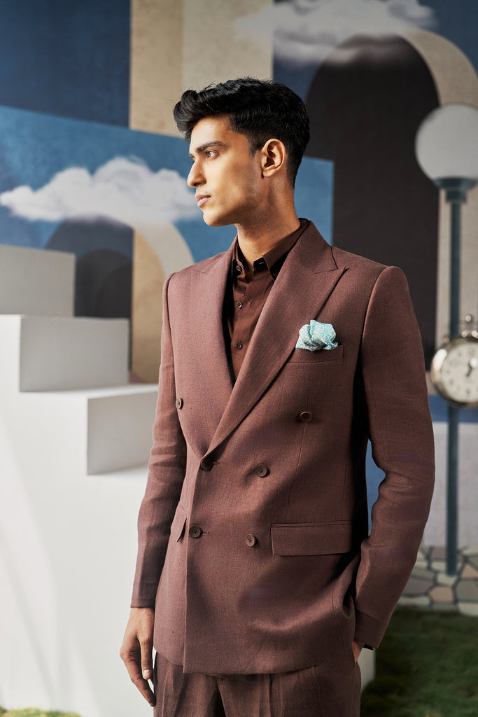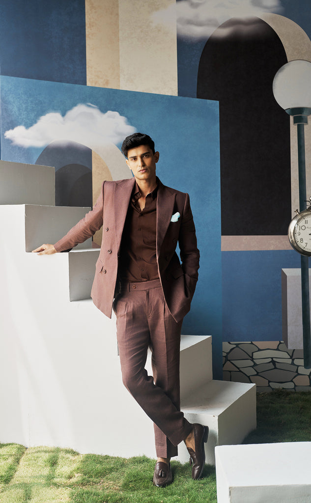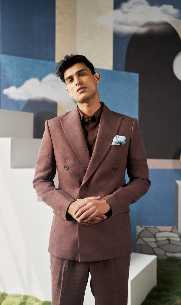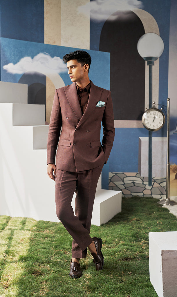 Stay sharp and cool in this double-breasted brown linen suit. Crafted from 100% linen, it blends structured tailoring with breezy comfort. Perfect for summer weddings, outdoor events, and effortless daytime elegance.