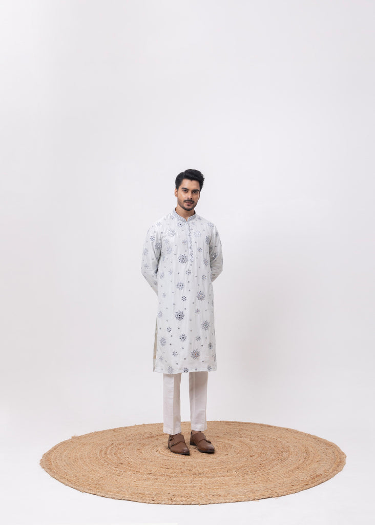 Elegant skyblue designer kurta for men featuring intricate mirror work in floral patterns, adding a subtle sparkle and festive charm.