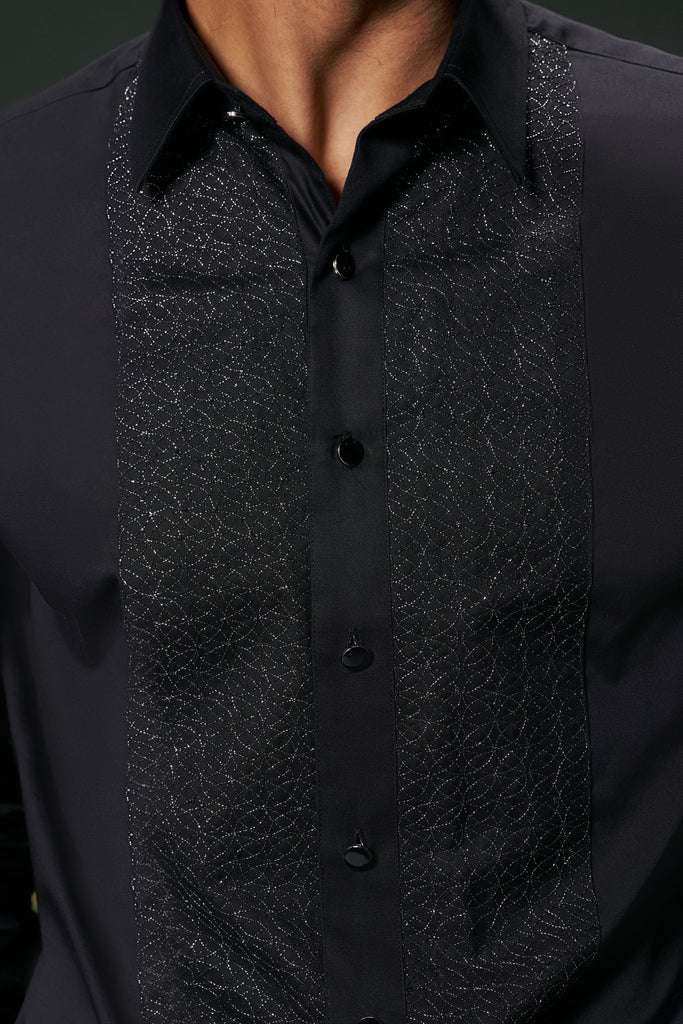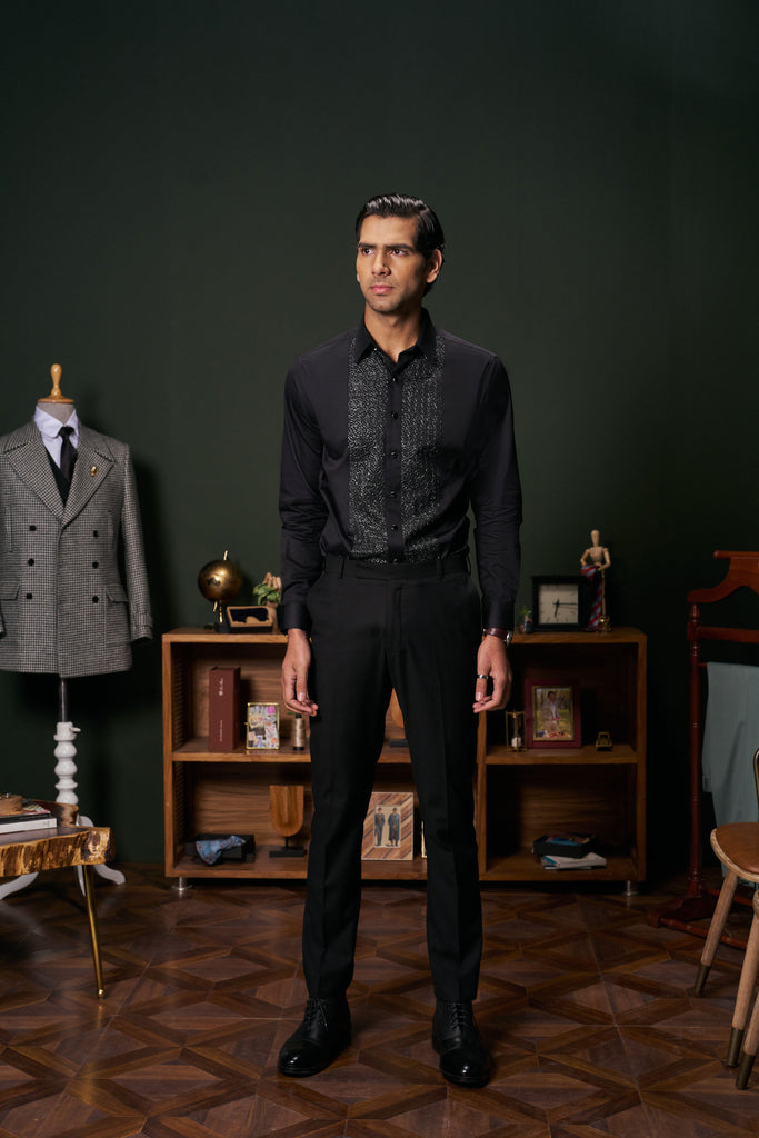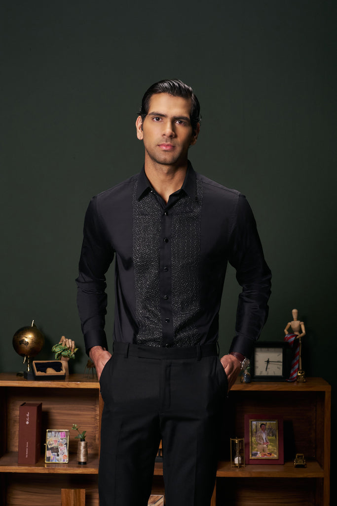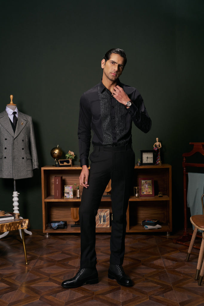 The Cinder tuxedo shirt combines classic tailoring with a dash of flair. Crafted for the modern gentleman, its sleek black fabric is elevated by intricate silver zari embroidery, adding just the right amount of sparkle. Perfectly fitted, this shirt brings bold sophistication to any formal occasion, offering timeless style with a touch of modern charisma. Whether at a gala or a cocktail party, Cinder makes sure you stand out with effortless charm and elegance.