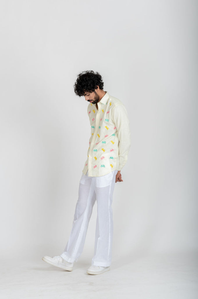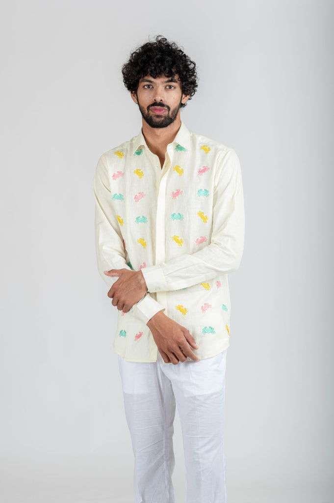 Embroidered in summery hues, crab motifs in the shirt are attention seeker. Wear it anywhere, anytime and with any bottom. It is an exotic wear with statement style.