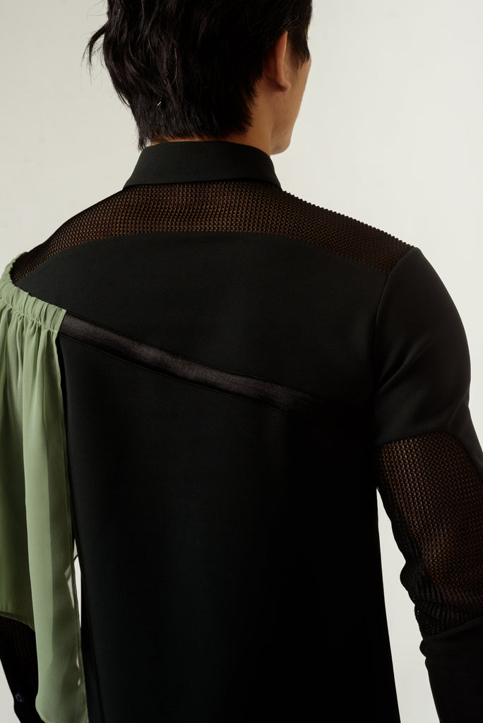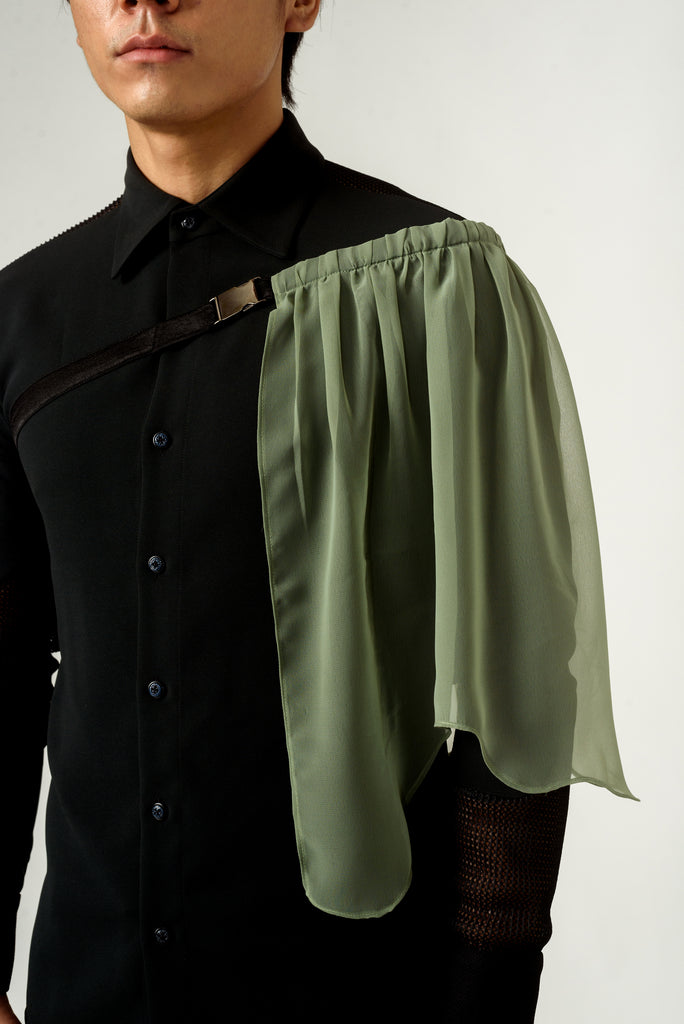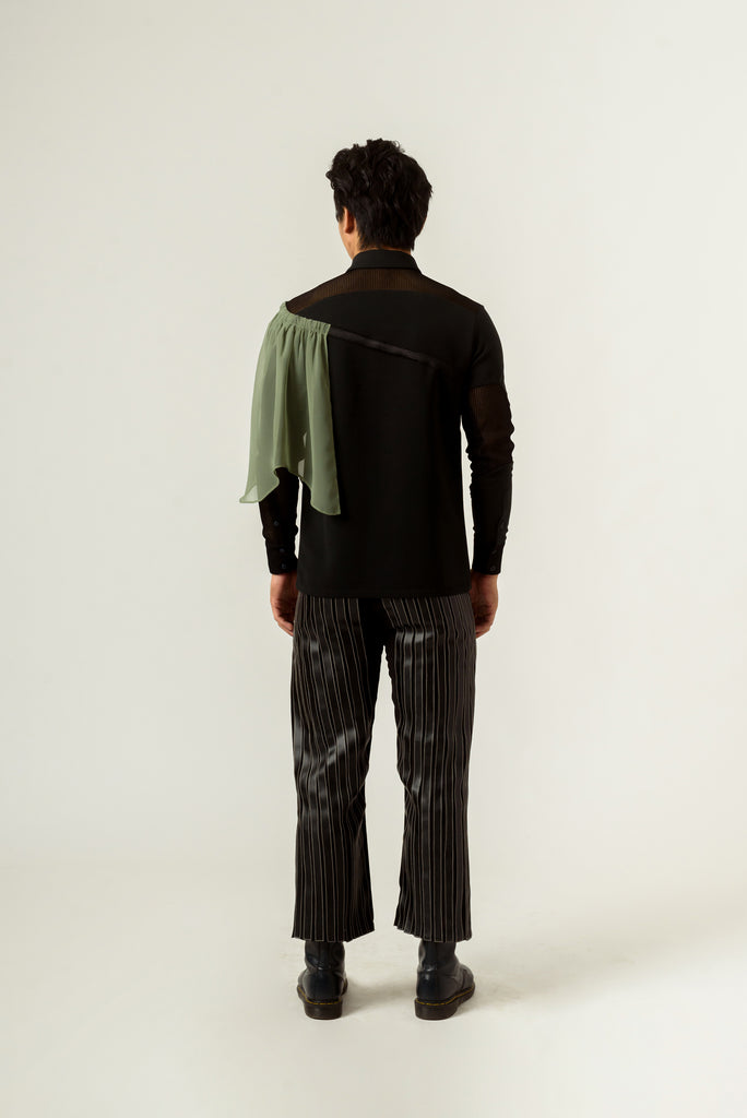 This royal look can make anyone feel special. The spectacular shape broadens the shoulder and the stripes elongated the legs. Style in this one to make a mark. Crafted in poly-textured crepe this dark grey shirt features a sage green georgette fabric fall at shoulder attached via buckle strap in velvet satin. This shirt has a front button opening. This unique style is a perfect way to make a statement.
