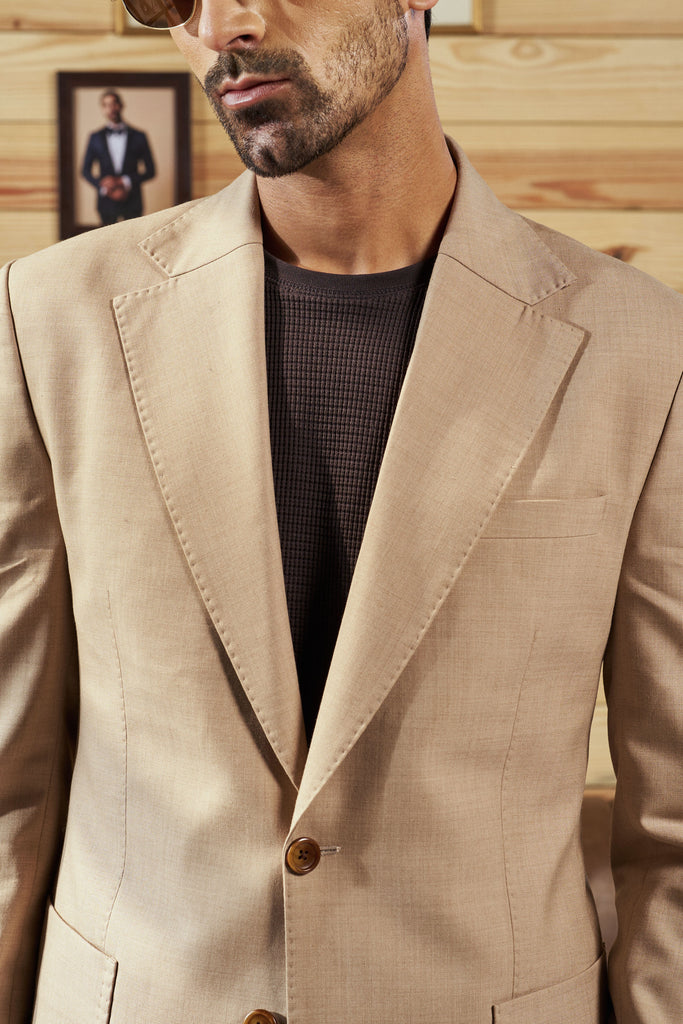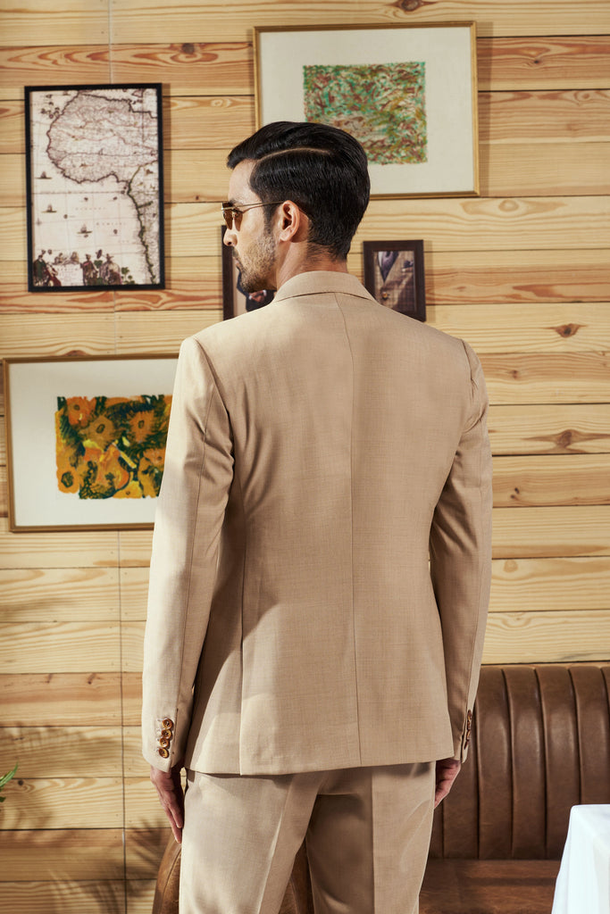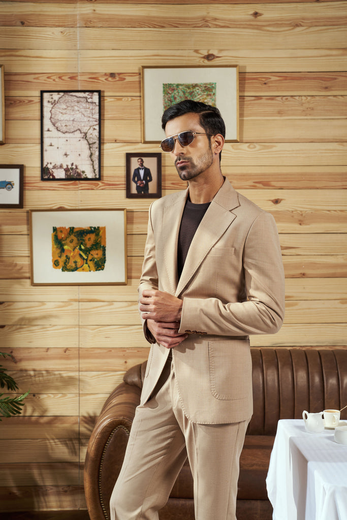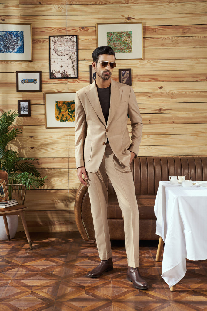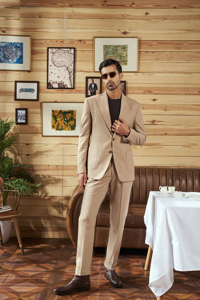 The Duner suit in refined beige embodies timeless style and versatility. Featuring the Sirocco jacket with a notch collar, pick-stitch detailing, and patch pockets, paired with the Crest pants showcasing a slim fit, Gurkha waistband, and turn-up hem, this ensemble is the perfect blend of sophistication and contemporary charm. Ideal for both formal and casual occasions, it’s a wardrobe staple for the modern gentleman.