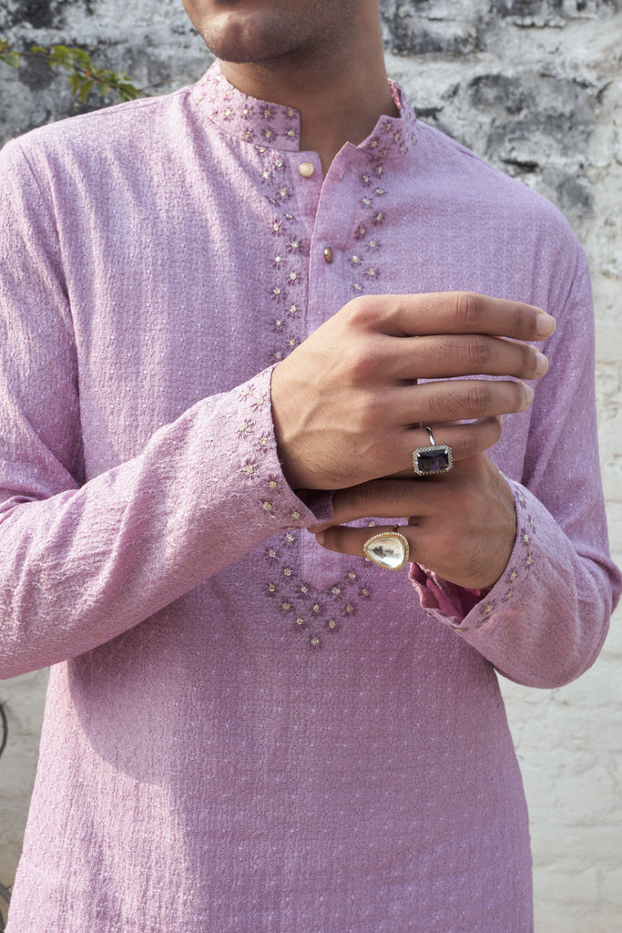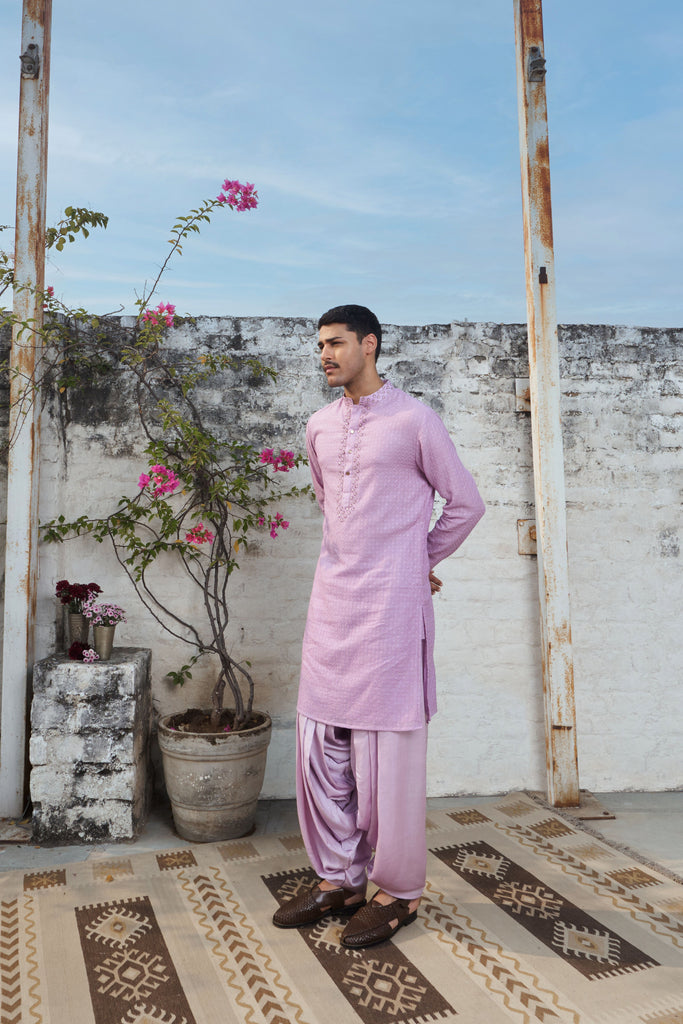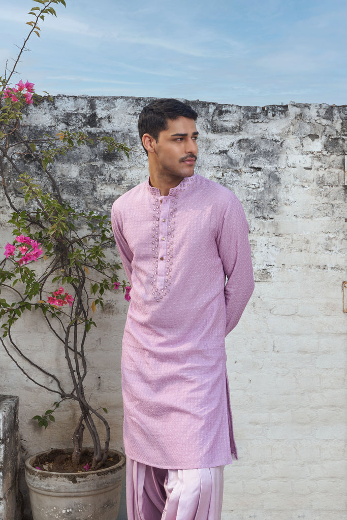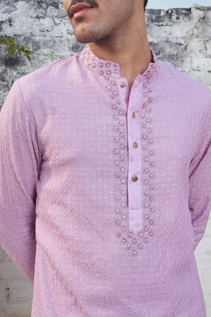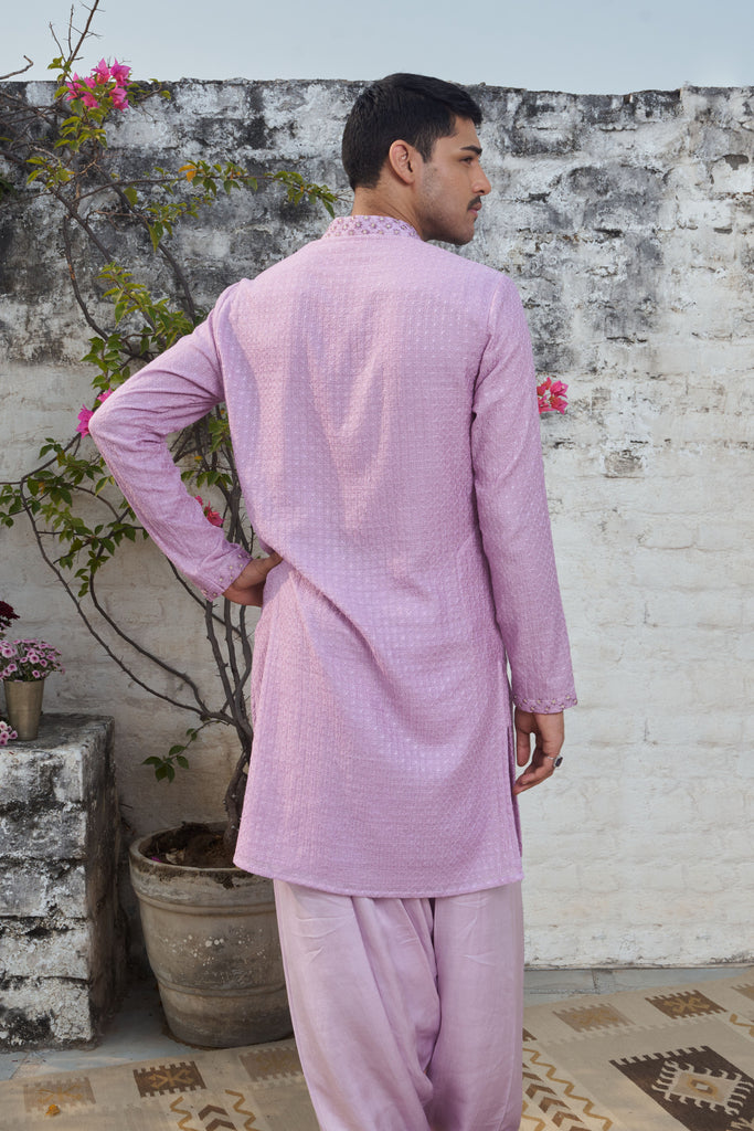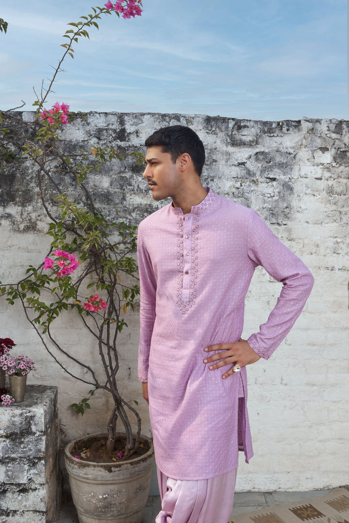 a chikankari textured kurta in a shade of ethereal lavender. With delicate embroidery adorning the placket, collar, and cuffs, this piece evokes a sense of timeless elegance and whispers of a bygone era.