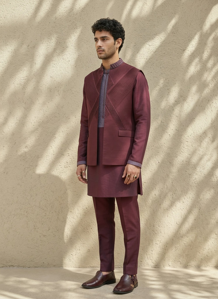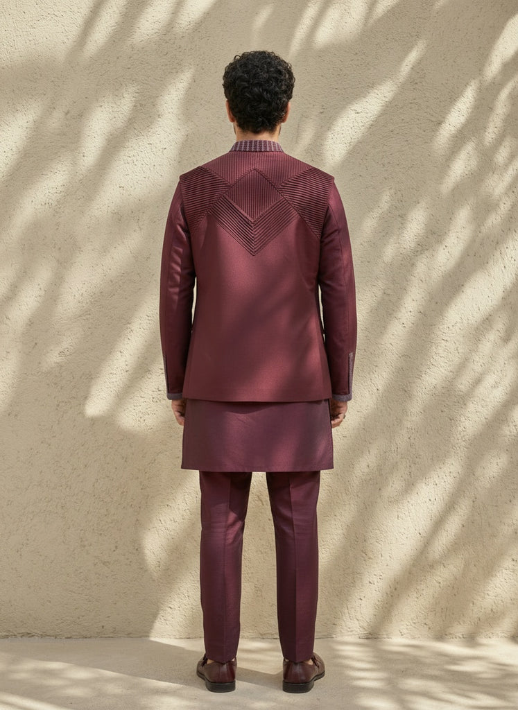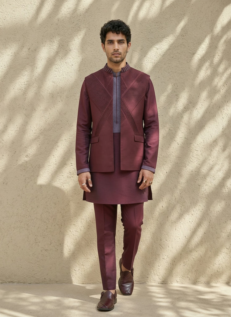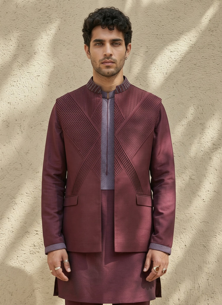 Maroon pintucked embroidered bandhi jacket