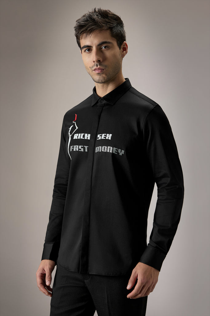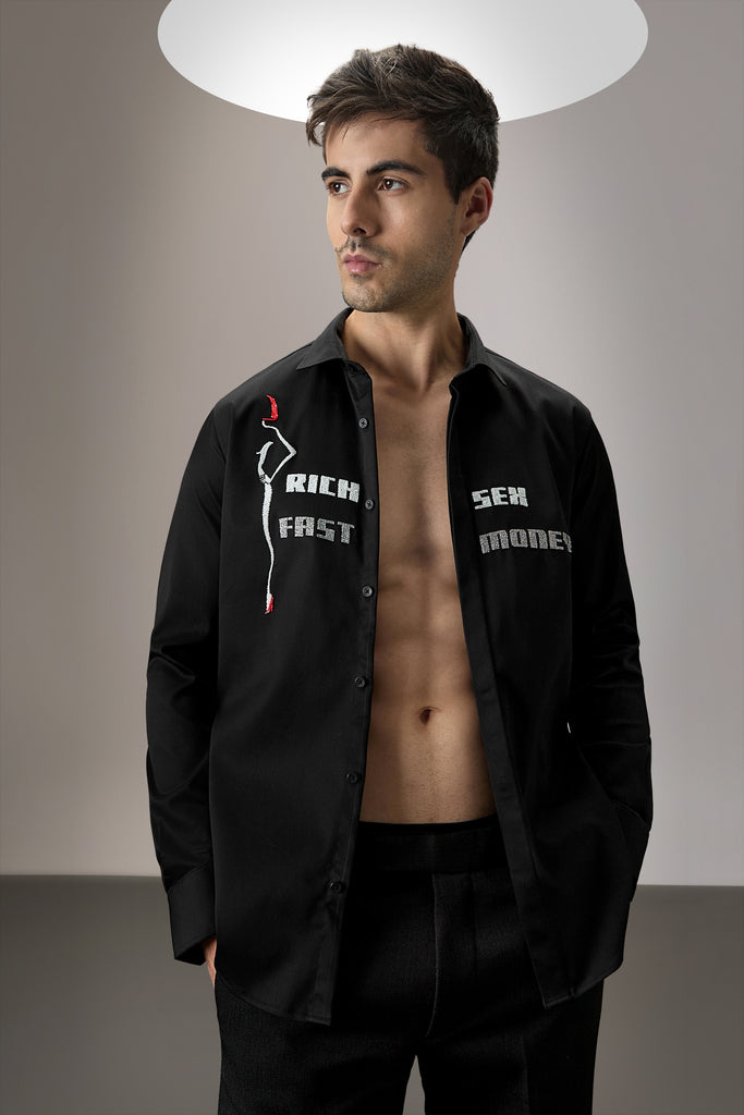 Blend modernity and charm with fast-money-themed embroidery on this designer shirt, crafted for a daring fashion choice.