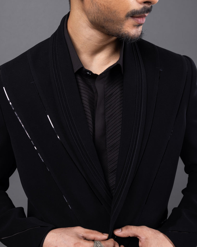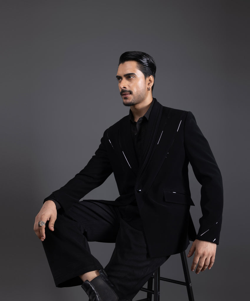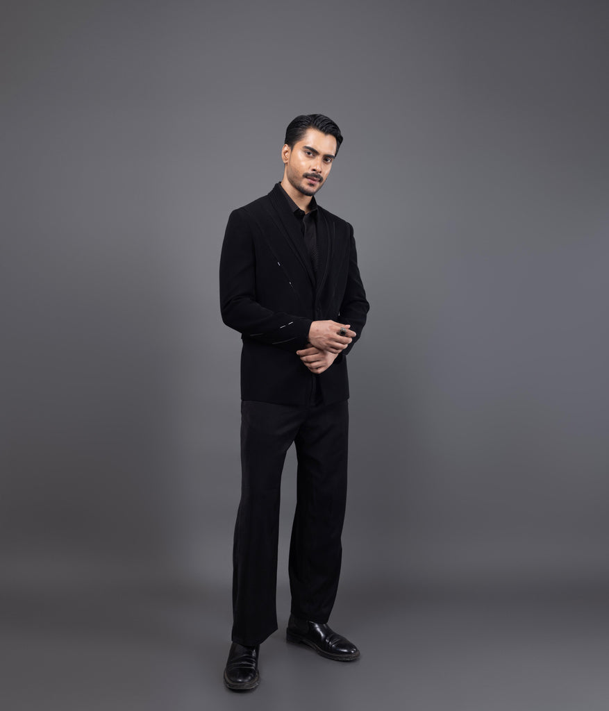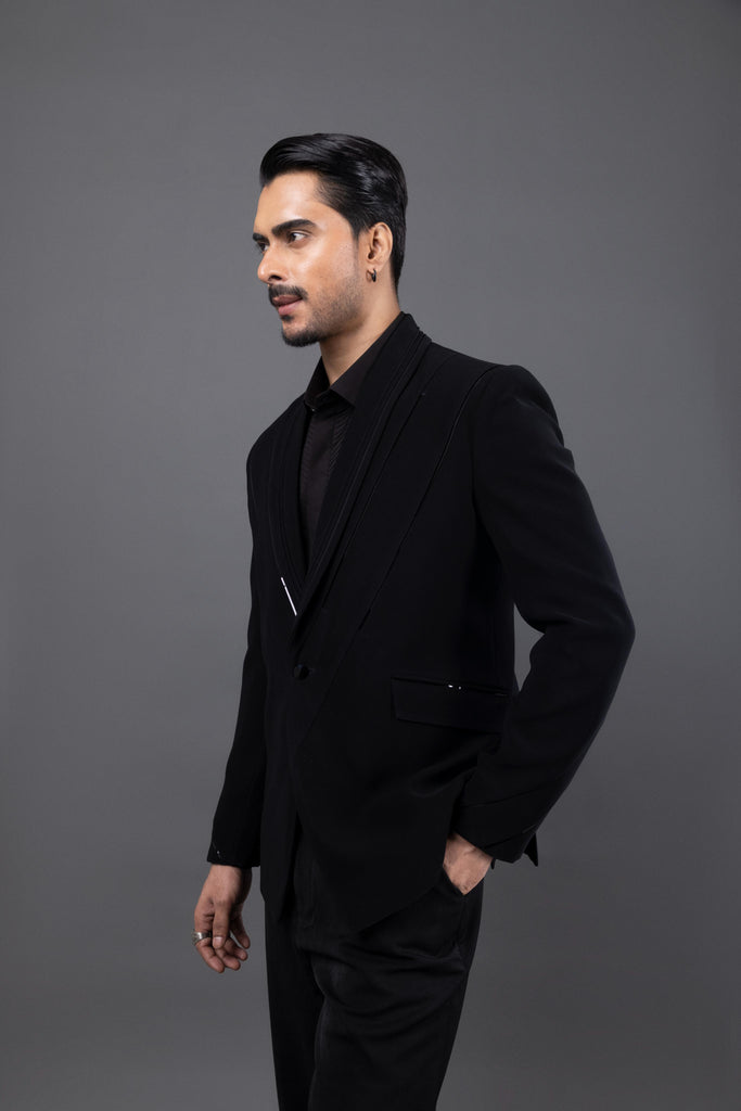 Introducing the FILM TUX, a sophisticated blend of modern elegance and classic style. This tuxedo features a sleek black fabric with striking white accents that enhance its tailored silhouette. The shawl collar adds a touch of refinement, while the intricate detailing on the jacket showcases meticulous craftsmanship. Perfect for formal events, the FILM TUX ensures you make a lasting impression with its contemporary design and luxurious feel.