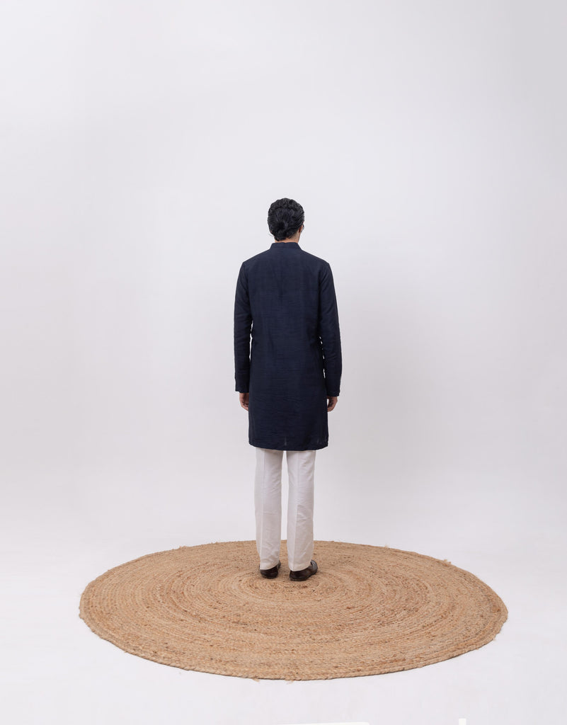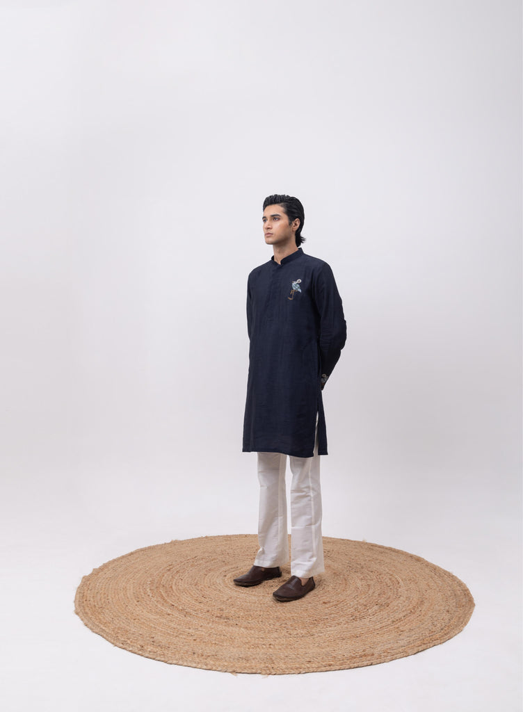 Flamingo Designer Kurta & Pant Set, a sophisticated ensemble that seamlessly blends tradition with contemporary style. Crafted from premium fabric, the kurta features a rich navy hue adorned with an intricate flamingo embroidery, adding a touch of elegance. The mandarin collar and tailored fit enhance its modern appeal, while the accompanying pants ensure a polished look. Perfect for festive occasions or formal gatherings, this set embodies refined craftsmanship and timeless charm.