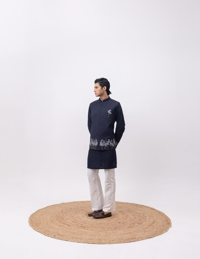 A navy designer Nehru jacket adorned with silver flamingos, gracefully scattered at the hem and chest, this piece balances minimalism with majestic detailing for modern celebrations. This is paired with a kurta and pant.