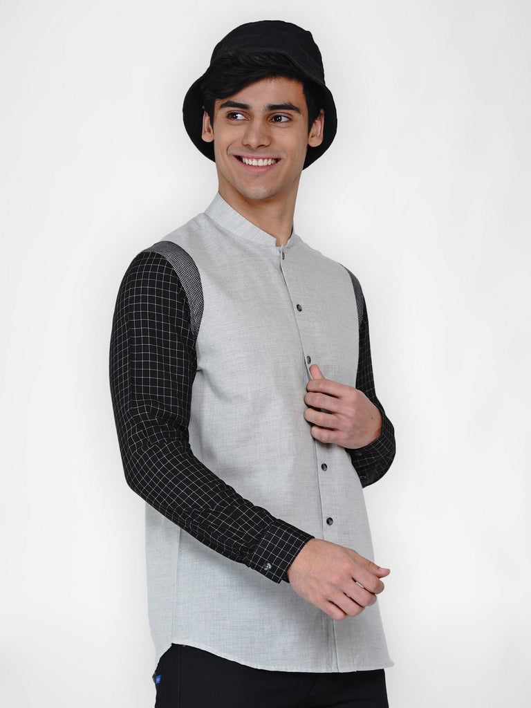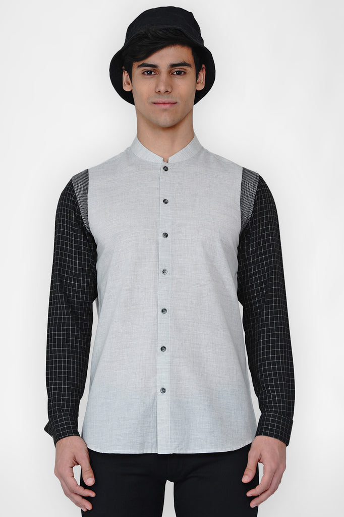 Grey melange shirt with stylised cut and sew detailing close to armhole in grid pattern adds up an athleisure feel to it. Rayon black texture has been used in the sleeves along with a stylised chinese collar.This shirt has a great mix of textures and colours yet it is balanced and pleasing to the eye.
