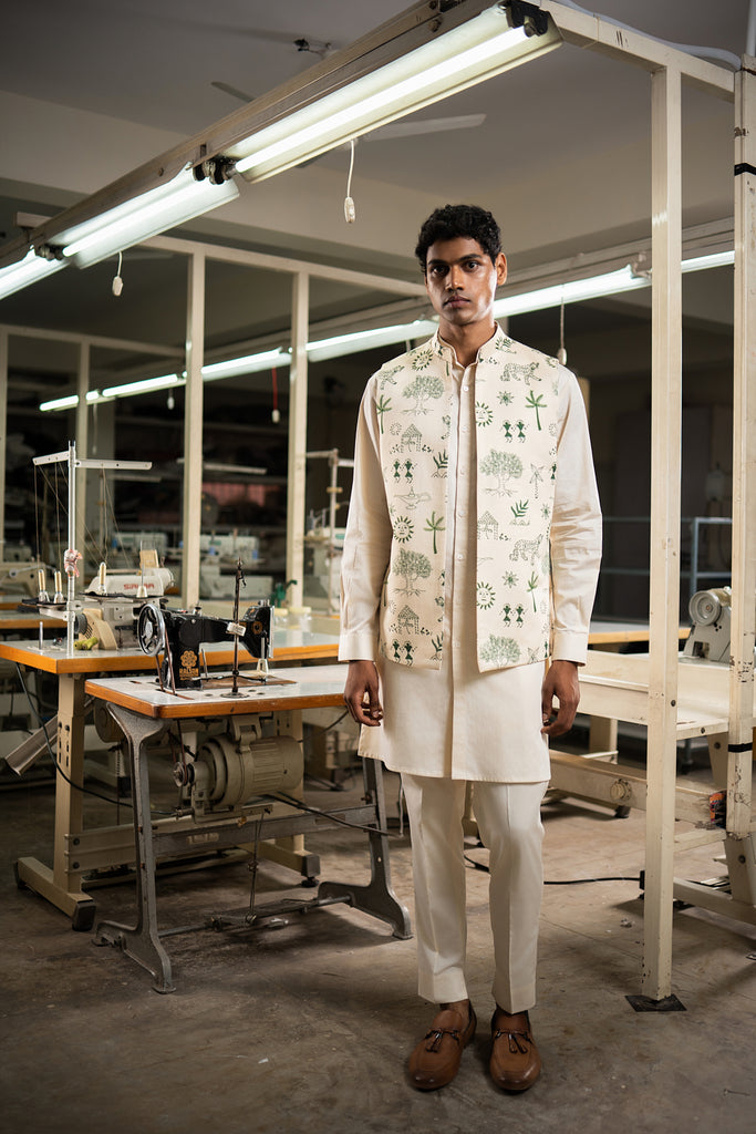 This set combines a printed open-style bandi in and shirt-style kurta in a luxurious linen satin fabric and a matching pajama. The bandi features a mandarin collar and buttonless design, showcasing an exclusive print inspired by kantha embroidery. The sleek contemporary cut of the shirt kurta makes it easy to wear and includes cuffed sleeves, and two hip pockets. The cotton trouser style pajama features an elasticated back, zip and fly front closure, and two hip pockets. The pajama is cut to a slim fit and has ankle slits for ease of wear. Wear together for a refined look or separately for versatile styling.