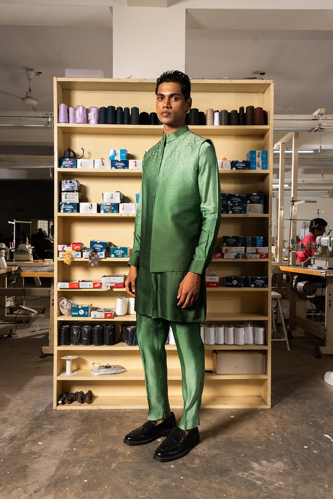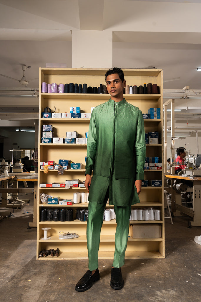 GREEN YAARA OPEN BANDI WITH MATCHING KURTA PAJAMA SET
