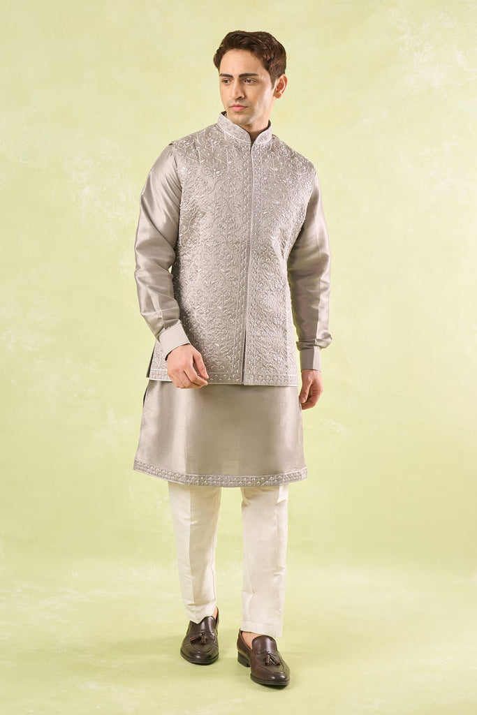 Grey raw silk based jacket enhanced with pearl and cut dana embroidery paired with a matcing cotton silk based kurta and an off white dupion silk based mexican pants.