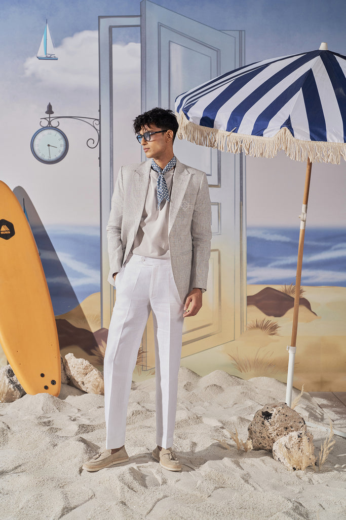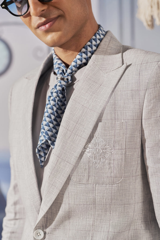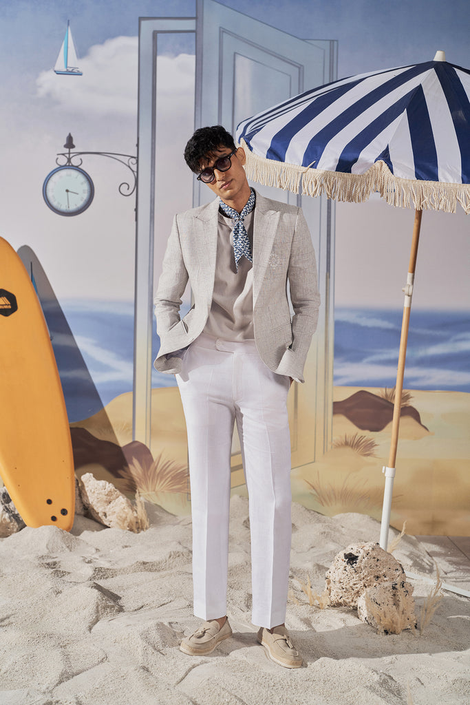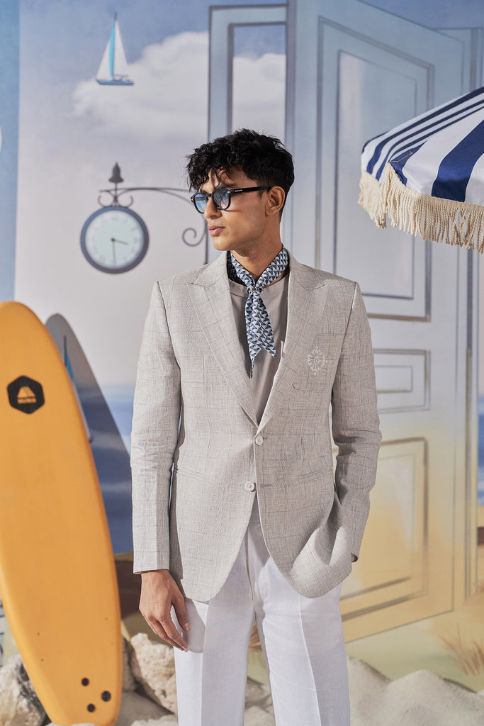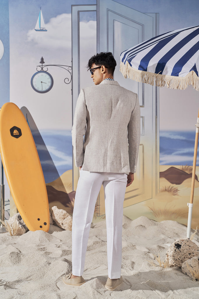 Tailored from breathable linen with geometric embroidery stitched into the patch pocket, this blazer is built for creative offices, sundown gatherings, and any evening where first impressions matter — and details speak louder than words.