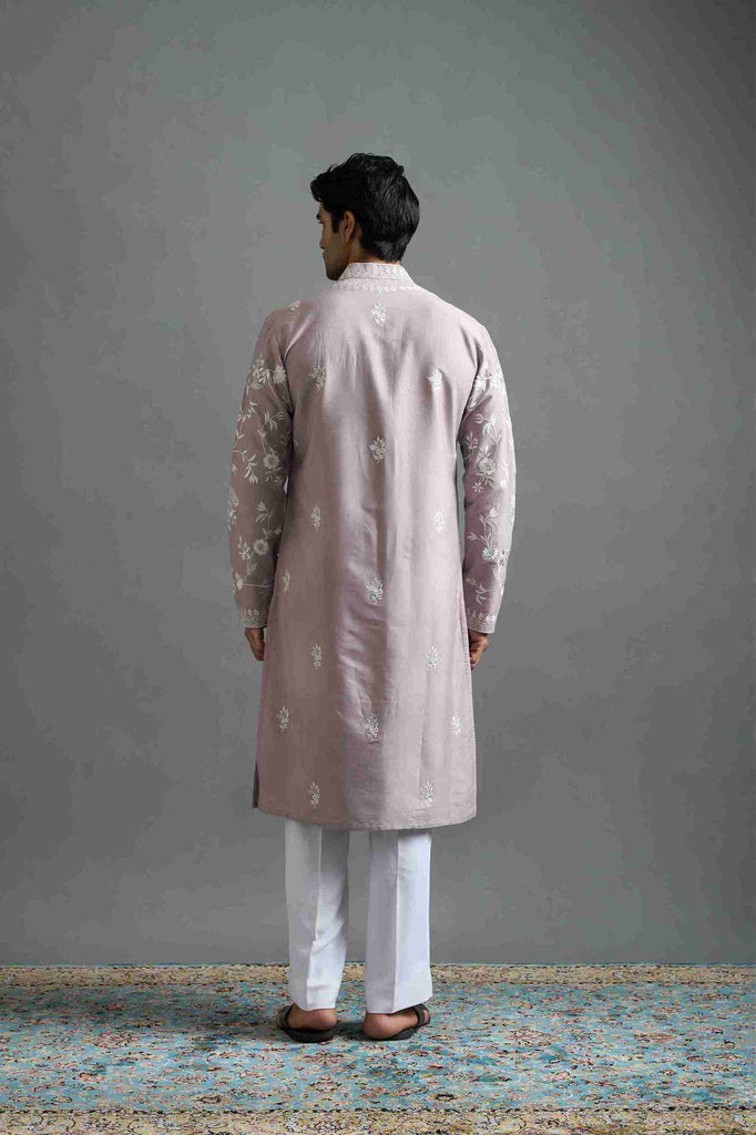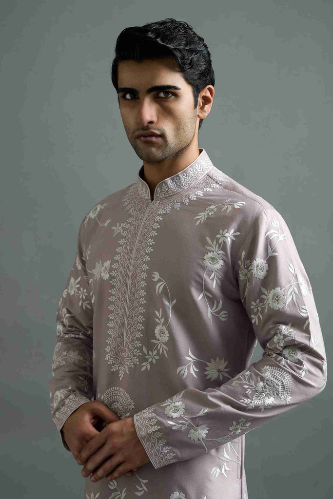 An elegant dusty mauve kurta detailed with ivory floral embroidery, crafted for understated celebration. Inspired by roses blooming in wedding rituals, it blends refinement with quiet charm. Lightweight and versatile, it transitions seamlessly from daytime ceremonies to evening gatherings. A graceful reflection of Samarpan’s promise — tradition softened with poetic modernity.