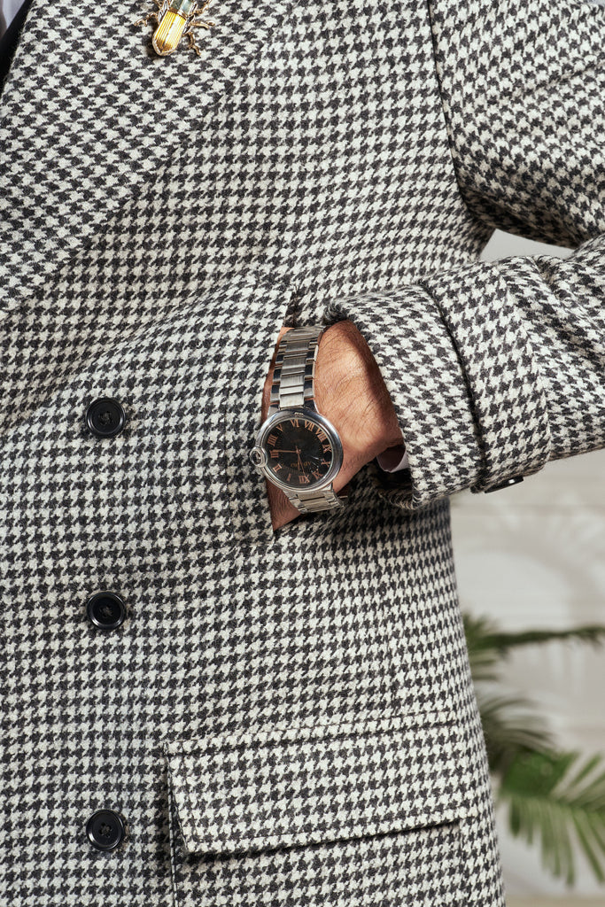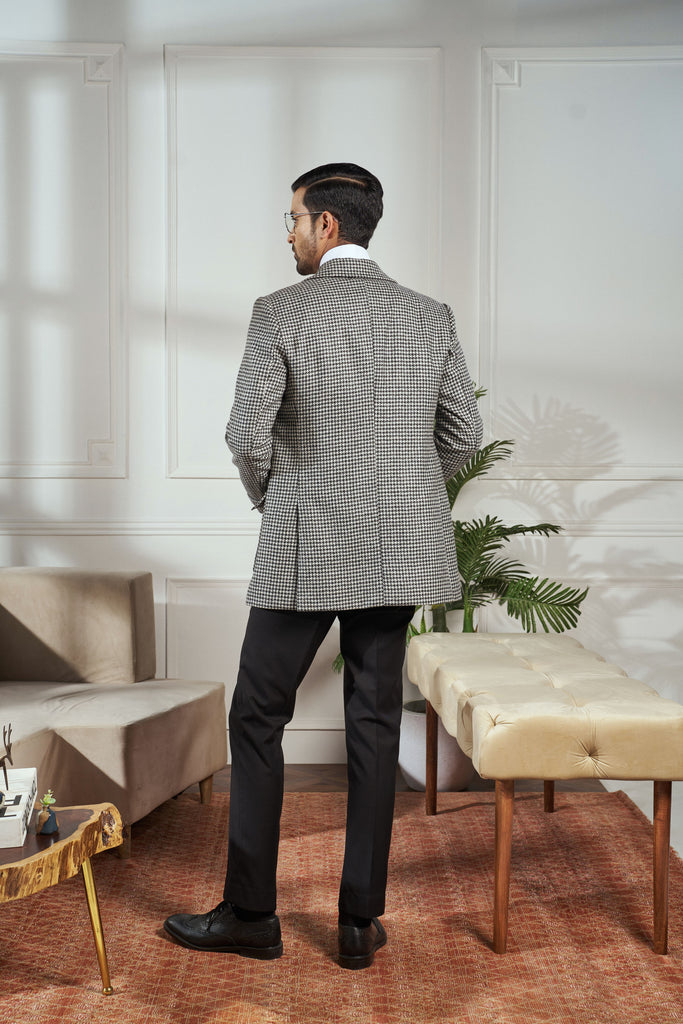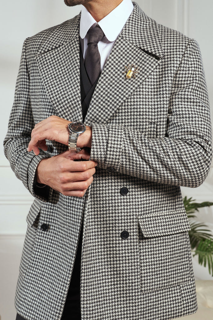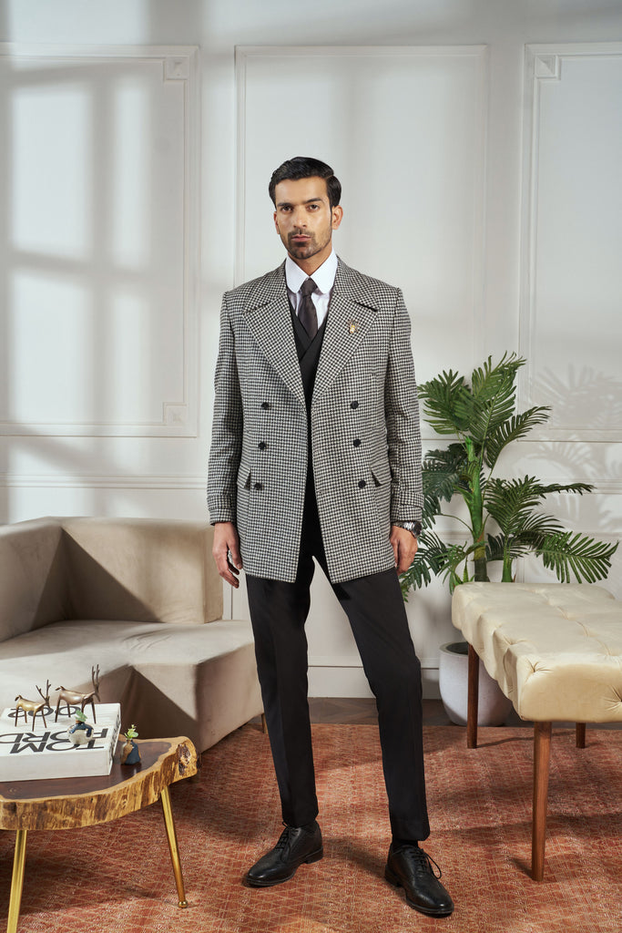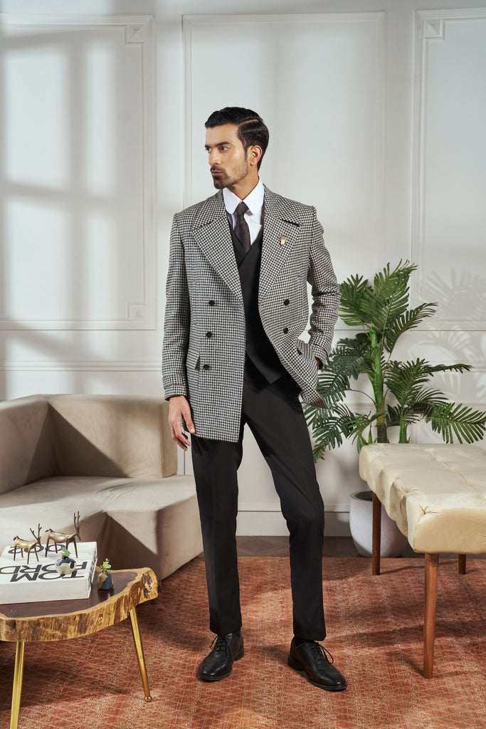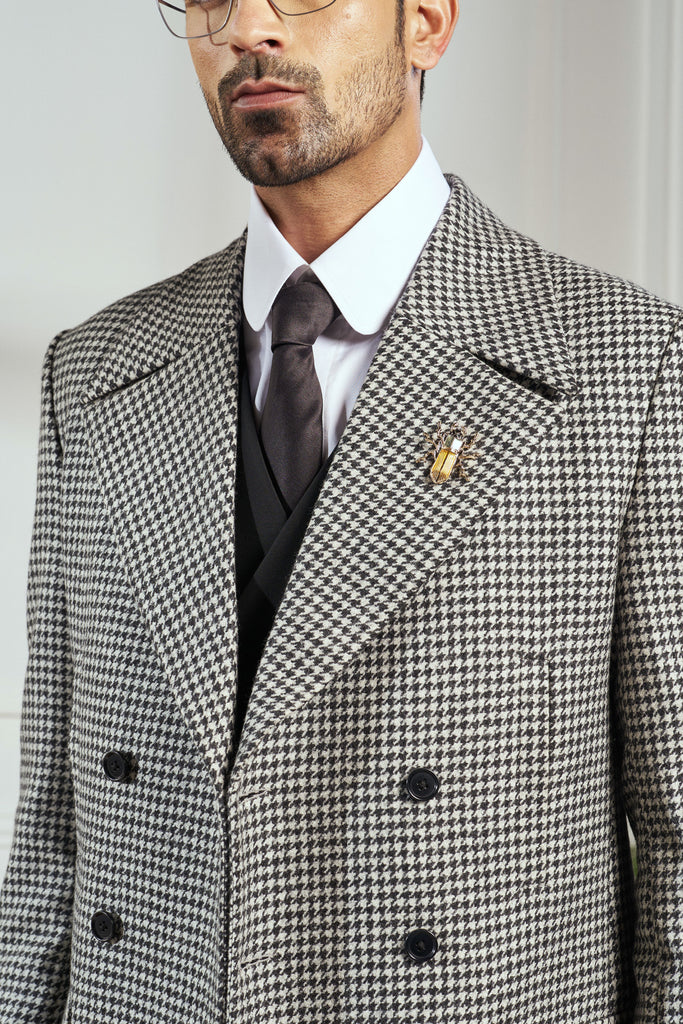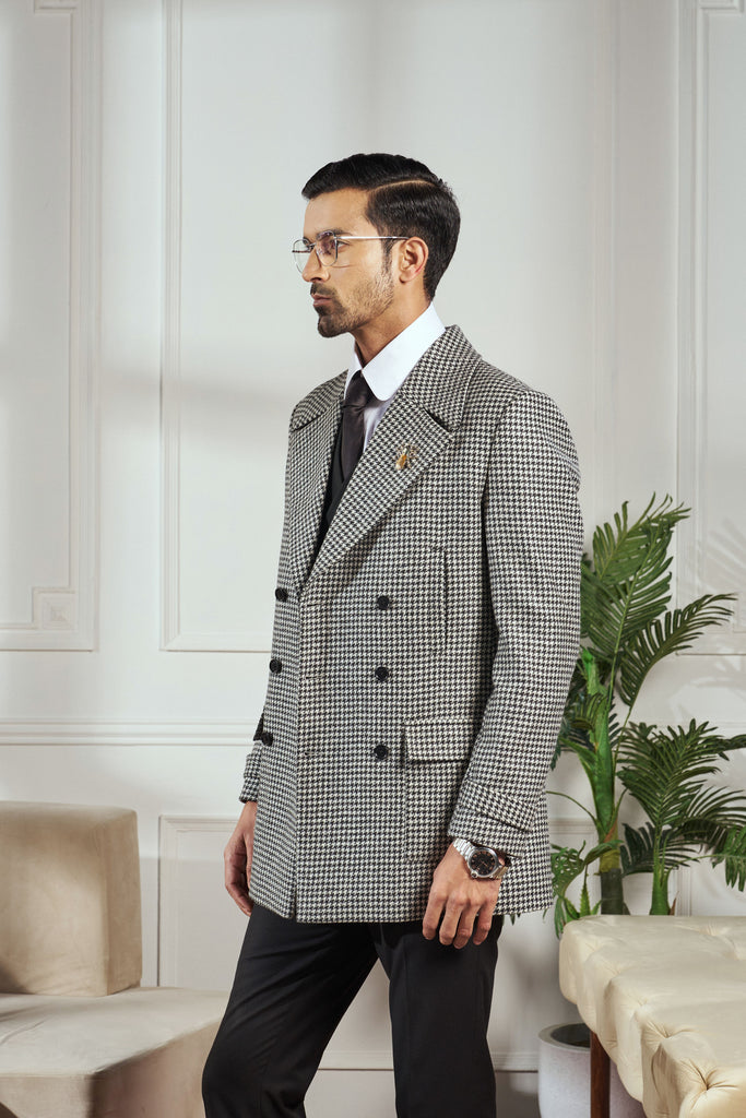 The Hawke overcoat, crafted in a bold black houndstooth pattern, exudes a refined yet commanding presence. Broad lapels, flap pockets, and a welt pocket detail add tailored sophistication, making it perfect for both formal and semi-formal occasions. The unique pattern and sleek silhouette deliver timeless style with modern flair, ensuring the Hawke stands out as a statement piece of effortless elegance.