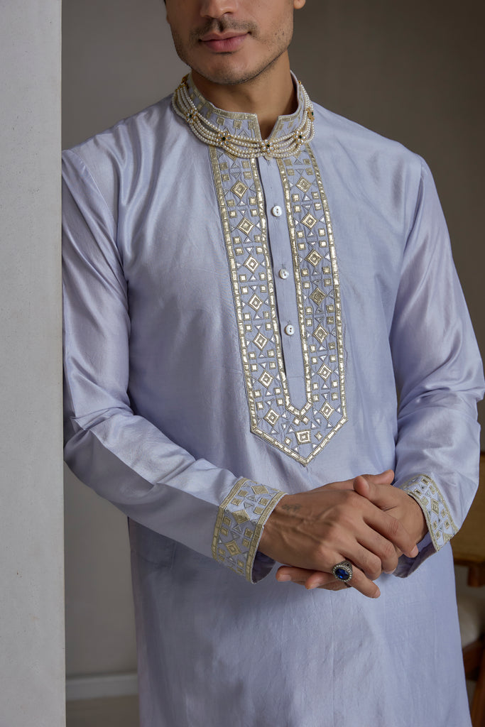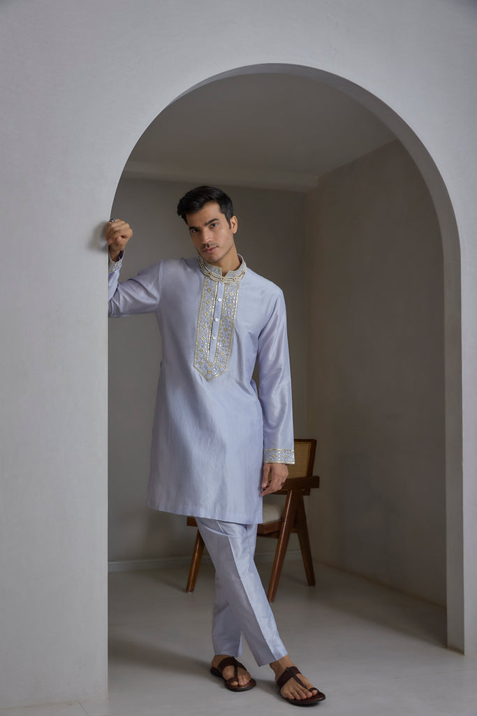 Featuring an Ice blue embroidered kurta with embroidery on the collar, around the button Patti and on the sleeve hem without lining & a pant.