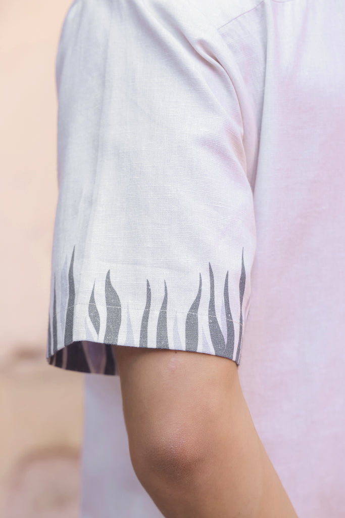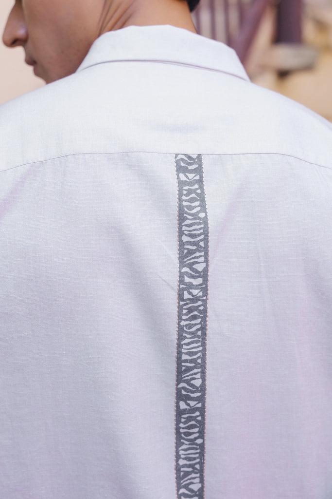 This handcrafted shirt is made using the finest blend of sustainable fabrics: linen, tencel, and cotton. It comes with a cuban/notch collar, our signature placement print, and subtle thread embroidery. Pair it with our airy linen cotton pants to complete the look.