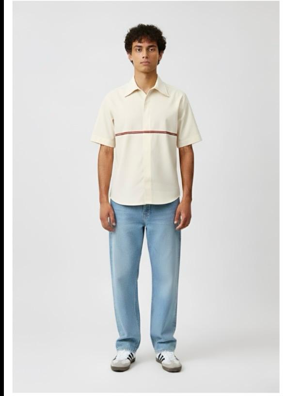 This ivory and tuscan red shirt is designed with a clean, structured silhouette and tuscan red horizontal stripe accent on the front. It features basic half sleeves with a horizontal stripe in the back and is finished with a classic collar. Easy to style for both work and everyday wear, this shirt combines function with a polished look.