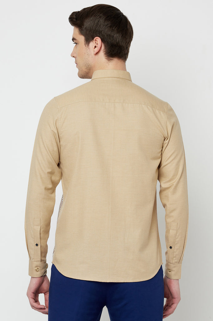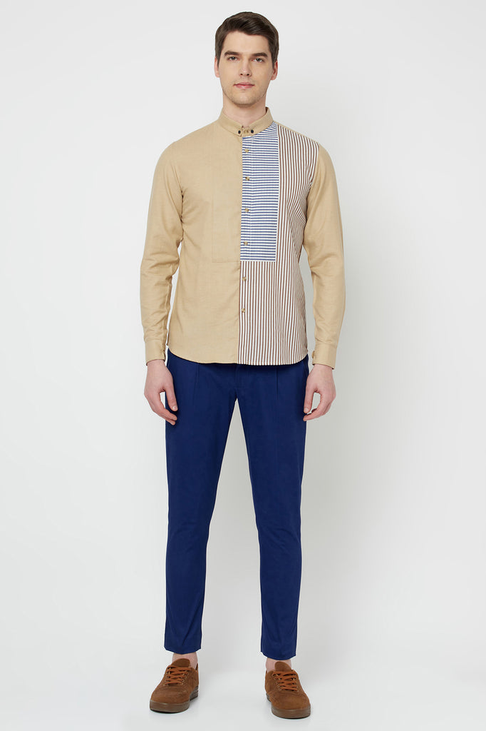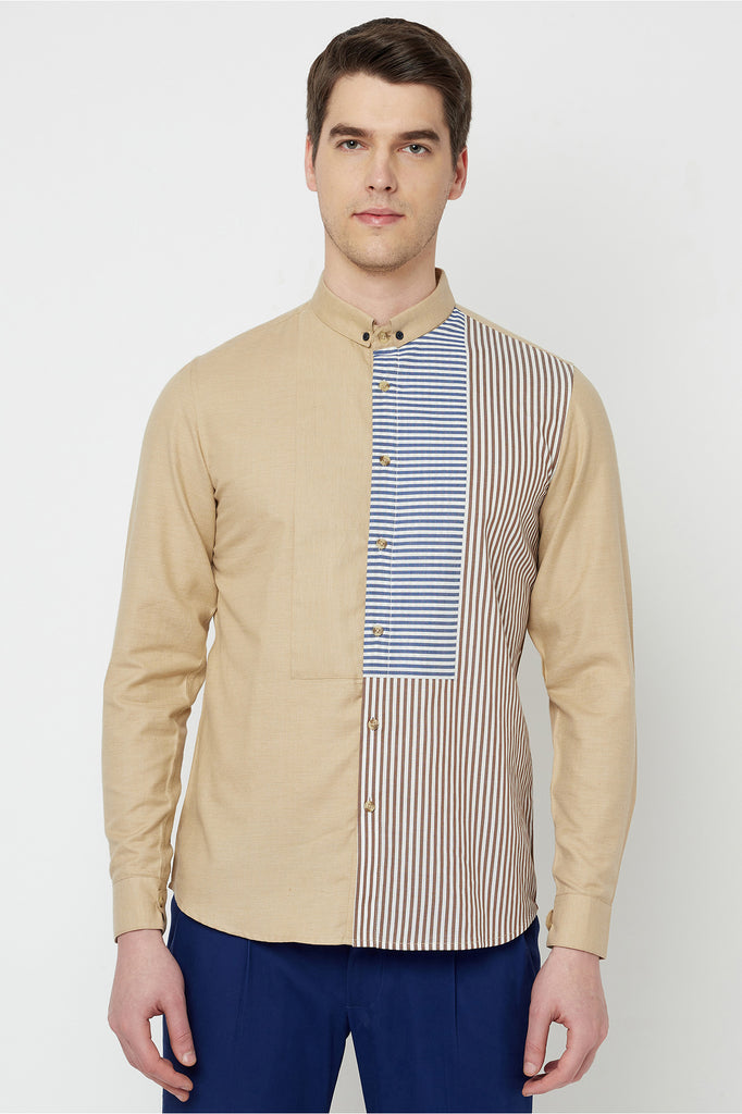 Cut and sew melange shirt with stripe panels in front. A dual coloured striped fabric has been used for paneling creating more impact on the overall look instead of a solid colour block. It is perfect to wear for dayouts or evening hangouts.The tones of this shirt will work with many trousers/lowers...