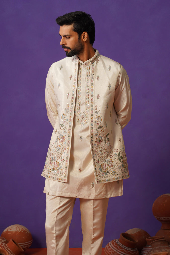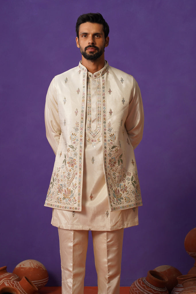 Crafted in luxurious pure tissue fabric, this short kurta jacket set exudes effortless elegance with a soft, luminous finish. The kurta features delicate detailing that adds depth while keeping the look refined and understated. Layered with a beautifully crafted jacket adorned with intricate motifs and fine embroidery, the ensemble brings together heritage artistry and modern sophistication. The tonal palette enhances its graceful appeal, making it perfect for daytime festivities and intimate celebrations. A timeless piece that blends subtle richness with contemporary charm.