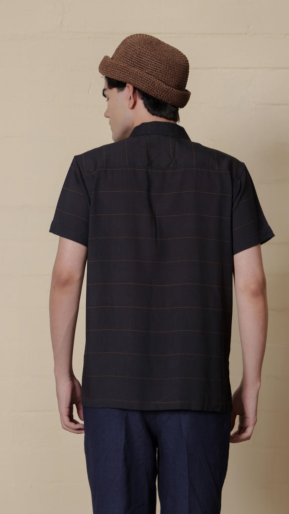 This half-sleeve dark grey rayon shirt features a camp collar and an engineered print inspired by modern art in vibrant colors, creating a striking visual contrast. The fluid, soft fabric ensures ease and comfort, while contrast buttons with red thread detailing add an unexpected pop. Artistic yet wearable, perfect for...