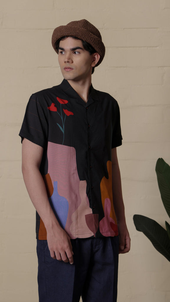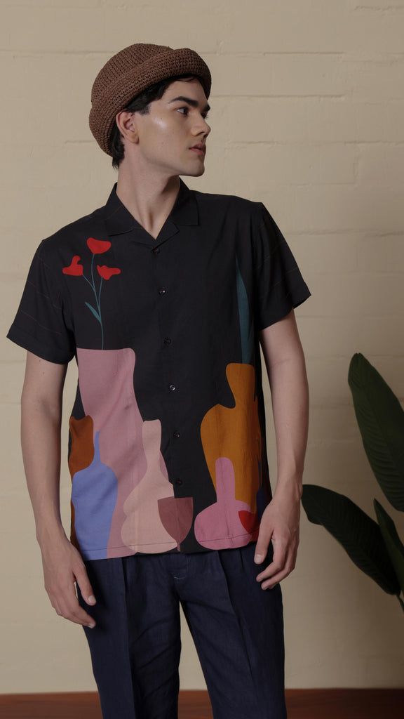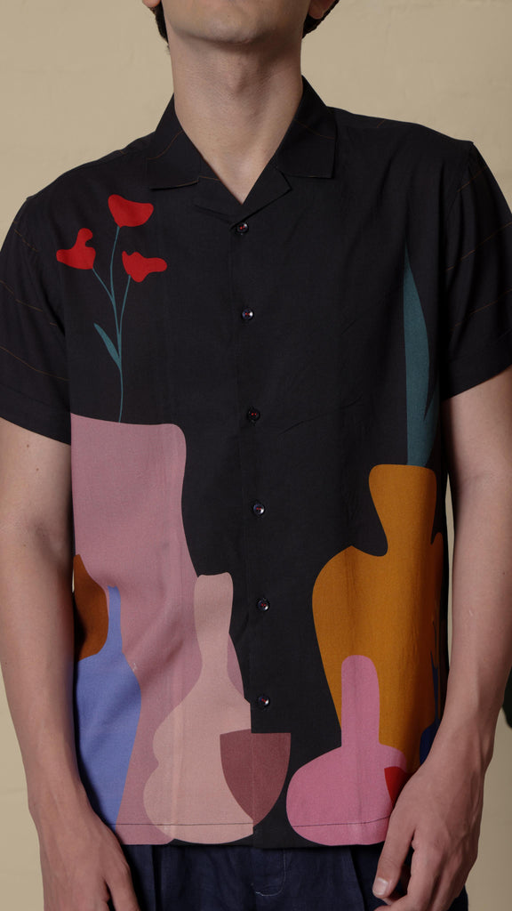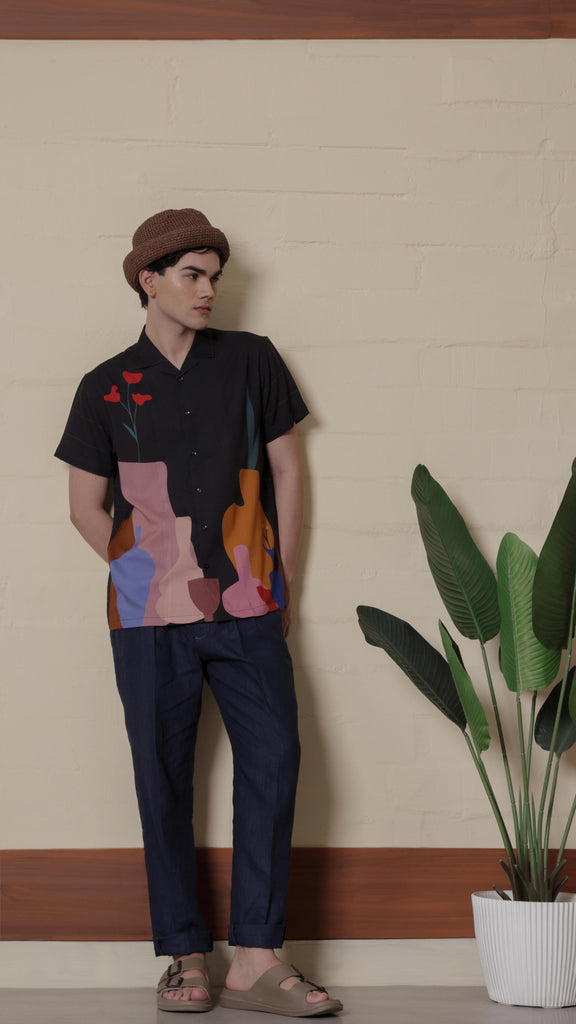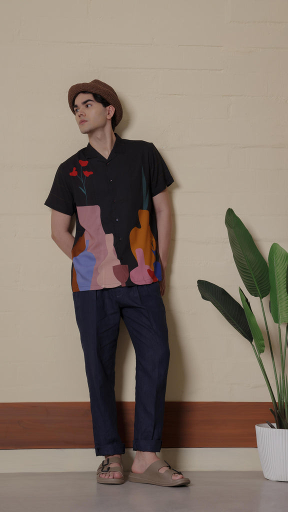 This half-sleeve dark grey rayon shirt features a camp collar and an engineered print inspired by modern art in vibrant colors, creating a striking visual contrast. The fluid, soft fabric ensures ease and comfort, while contrast buttons with red thread detailing add an unexpected pop. Artistic yet wearable, perfect for gallery strolls, creative meetups, or evening socials. Style tip:Style it with black trousers or off-white chinos and loafers for a bold, cultured look with a modern edge.