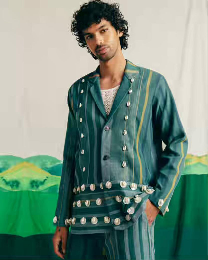 | Textured layers, statement detail. This blazer reimagines tailoring with an artisanal edge. Crafted in handwoven kala cotton fabric from Kutch, it features tonal teal stripes interwoven with subtle silver zari—meant to mimic sunlight sparkling on ocean waves. The lightweight, textured weave brings depth and movement to the classic silhouette. Designed in a relaxed, slightly boxy fit, it is finished with a notched collar and front button closure, while rows of shell embellishments add a striking, handcrafted finish across the front, hem, and sleeves. Bold yet refined, this piece blurs the line between structure and fluidity—perfect for layering or wearing as a standout on its own. |
