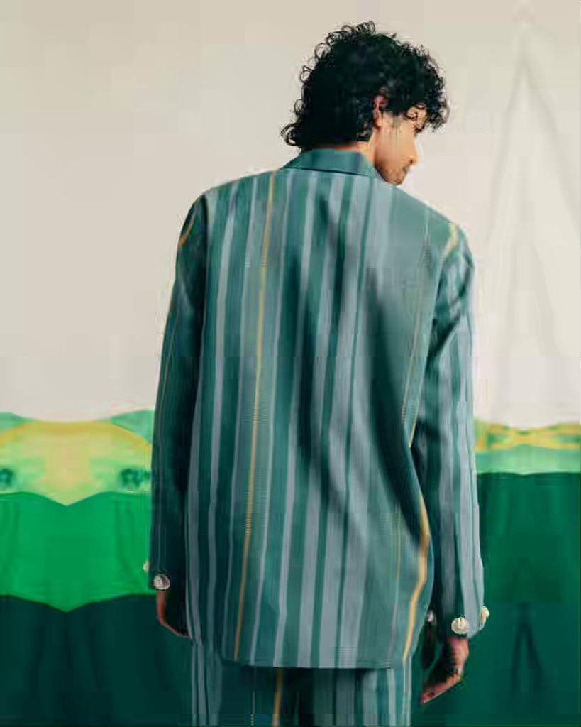 Textured layers, statement detail. This blazer reimagines tailoring with an artisanal edge. Crafted in handwoven kala cotton fabric from Kutch, it features tonal teal stripes interwoven with subtle silver zari—meant to mimic sunlight sparkling on ocean waves. The lightweight, textured weave brings depth and movement to the classic silhouette. Designed...