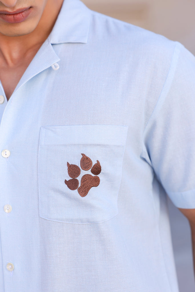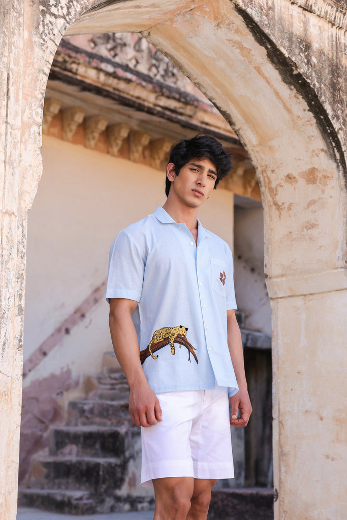 Light Blue Embroidered Cuban Collar Shirt Leopard