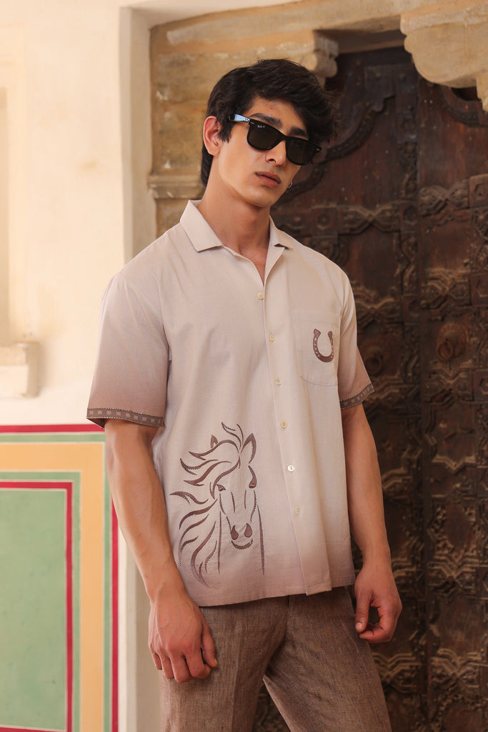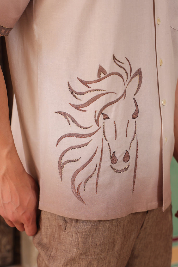 Light Brown Embroidered Cuban Collar Shirt Horse