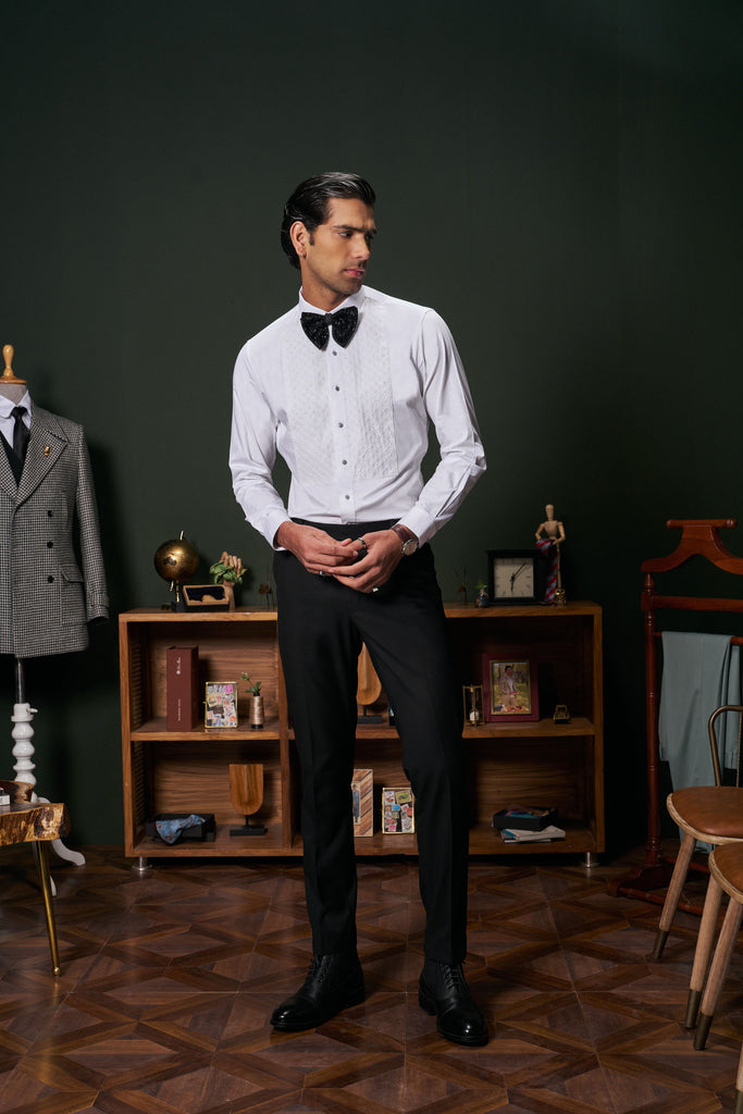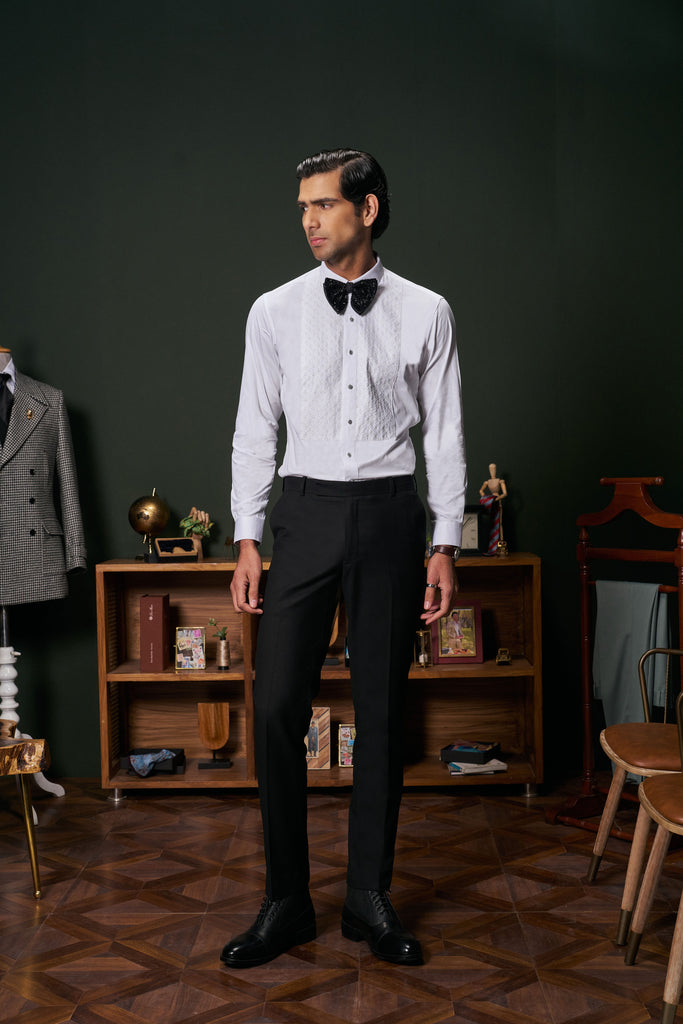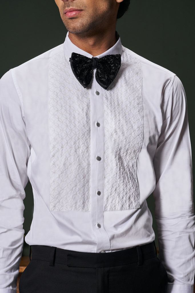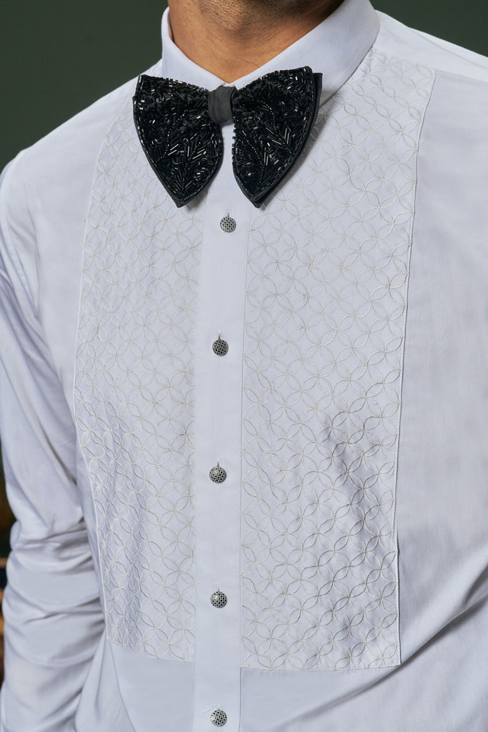 The Lumin tuxedo shirt embodies timeless sophistication with a modern twist. Crafted from pristine white fabric, it features intricate embroidery on the yoke area, adding a touch of artistry to its design. Tailored to perfection, this shirt offers a sleek fit that enhances the overall silhouette. Ideal for formal occasions, high tea, evening wear, parties, and cocktail events, Lumin ensures you make a lasting impression with its understated yet striking elegance.