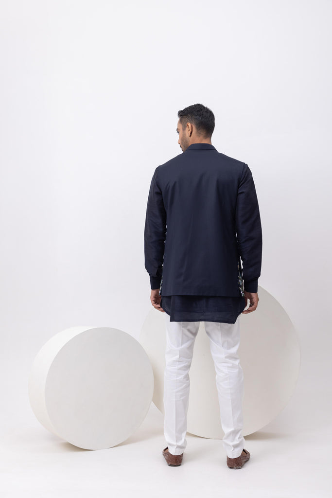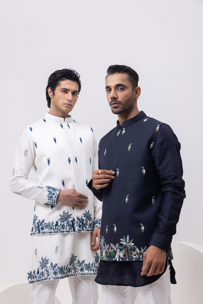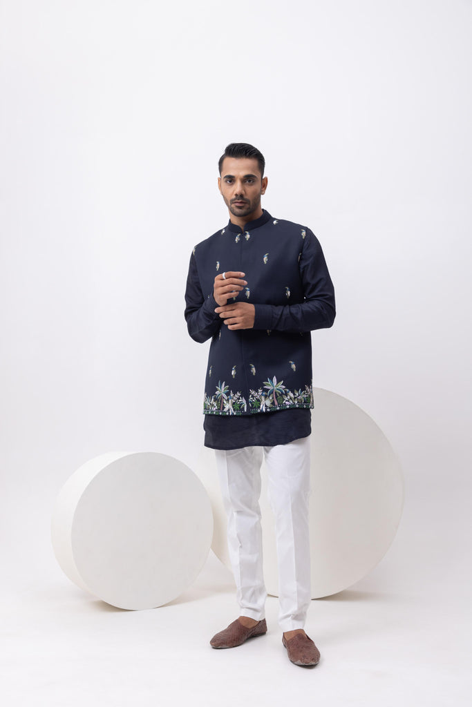 This embellished navy kurta blooms with palm and bird motifs at the hem and scattered detailing throughout, perfect for sundowners, soirées or destination weddings. This is paired with a kurta and pant.