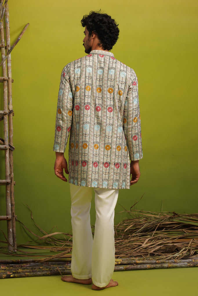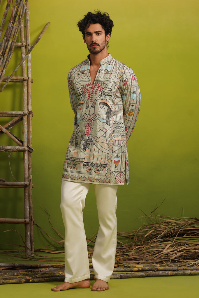 Crafted in luminous sky blue tissue fabric, this kurta beautifully captures the essence of traditional storytelling through Madhuban-inspired art. The design features two village women gracefully carrying pots on their heads, symbolizing everyday rural life and timeless cultural rhythm. Their detailed depiction, surrounded by intricate motifs and borders, brings a sense of movement and narrative to the garment. The natural sheen of tissue fabric enhances the artwork, adding a refined, festive glow. With its clean silhouette and rich visual story, this piece blends heritage, emotion, and modern elegance effortlessly.