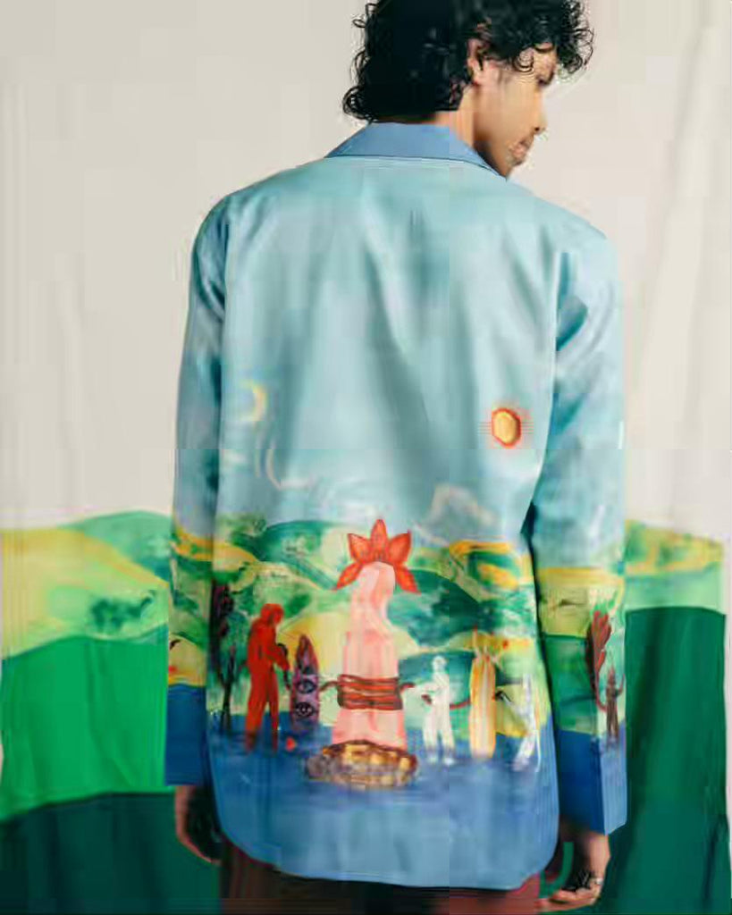 | A relaxed-fit blazer in a textured, breathable fabric, designed for effortless layering. The print draws from the mythical legend of Samudra Manthan—reimagined through a contemporary, painterly lens. Spanning across the hem and sleeves, the artwork captures a surreal churning of land, sea, and celestial elements, unfolding like a story in motion. Finished with a notched collar, tonal buttons, and clean tailoring, the silhouette balances structure with ease. A statement piece that blends mythology, art, and modern wearability. |