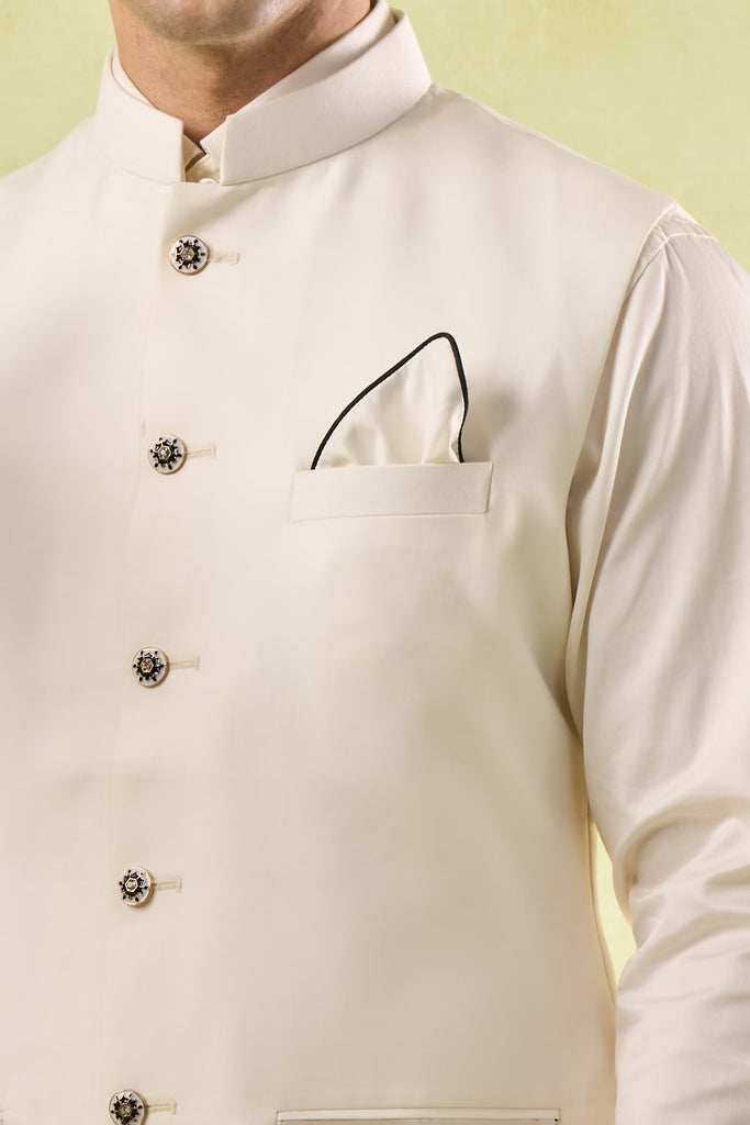 Off white french terry based jacket enhanced with black pipen detailing on hand pockets and pocket square and metal buttons
