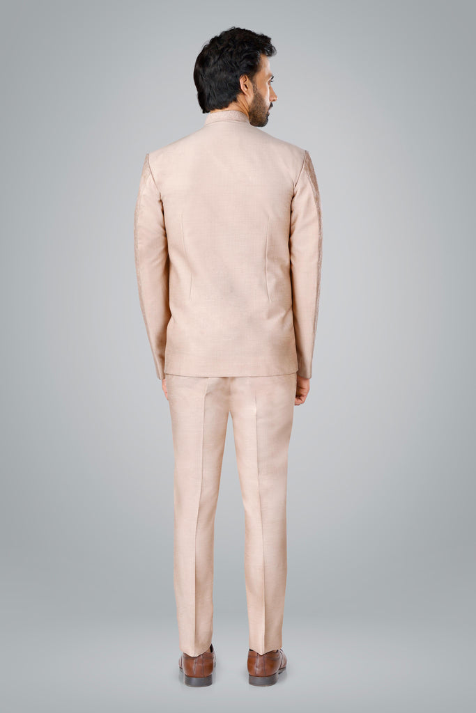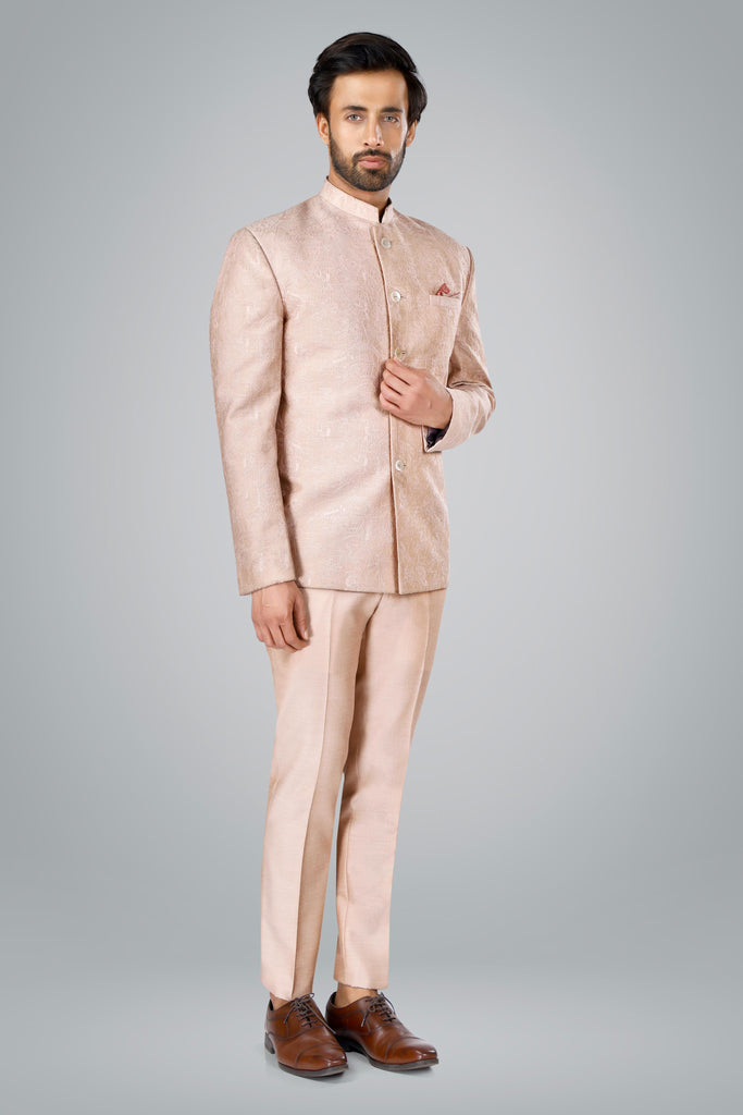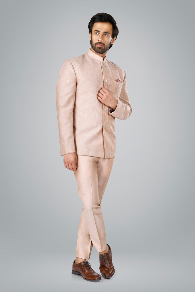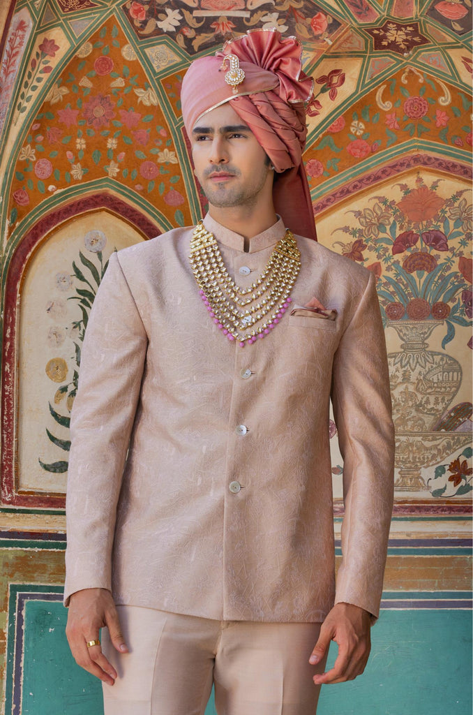 Old Rose Jodhpuri Coat with surface detailing of Forts embroidery all over. Matching trousers for bottom. Accessorised with coordinated pocket square.