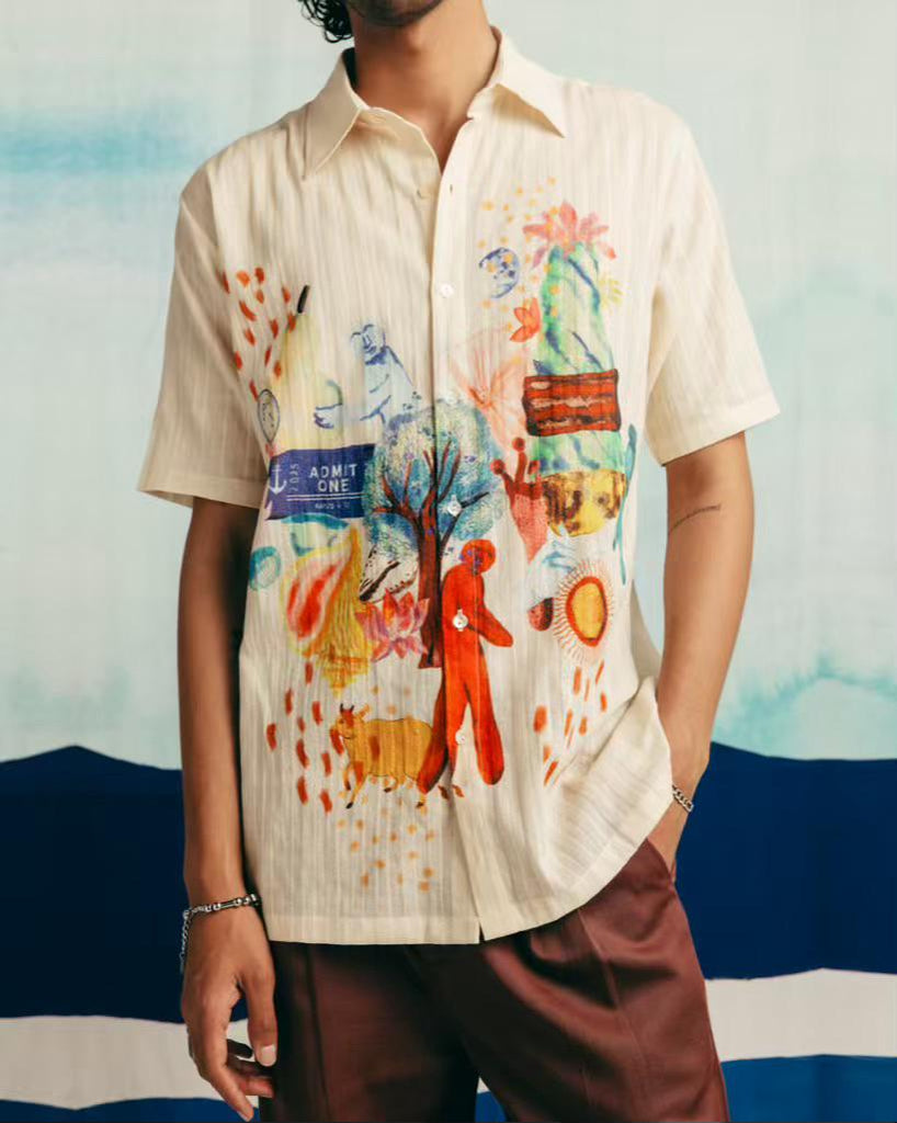A statement piece that tells a story, this shirt brings together elements from across the collection in a thoughtfully collaged print—like a visual summary, capturing moments, motifs, and memories in one frame. Set against a soft, textured base, the artwork feels layered and expressive, adding depth to an otherwise classic...