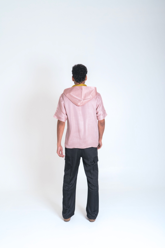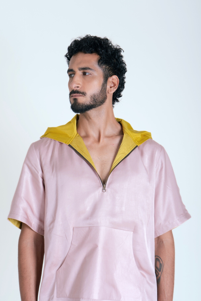 This trendy hoodie features a color-blocked design in pink and yellow. The main body of the hoodie is pink, with a playful twist of yellow peeking from the hood when worn. It is designed with a zip open front for easy wear and adjustment. The color-blocking adds a vibrant and modern touch to the hoodie, making it perfect for casual outings and adding a stylish flair to your wardrobe. Ideal for cooler days, it combines comfort with a bold fashion statement, ensuring you stand out with its unique design.