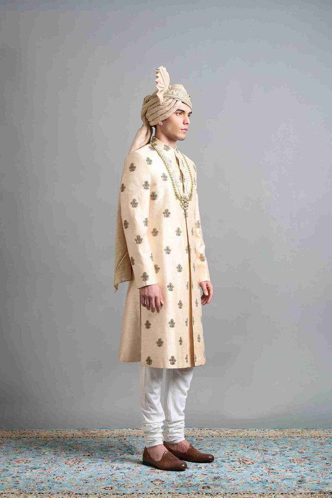 An light peach sherwani embellished with bold embroidered motifs, radiating regal elegance. Styled with layered pearl malas and a majestic turban, it evokes timeless heritage. Paired with ivory churidars, this ensemble is crafted for grooms seeking a powerful yet graceful look that honors tradition while standing out on their wedding day.