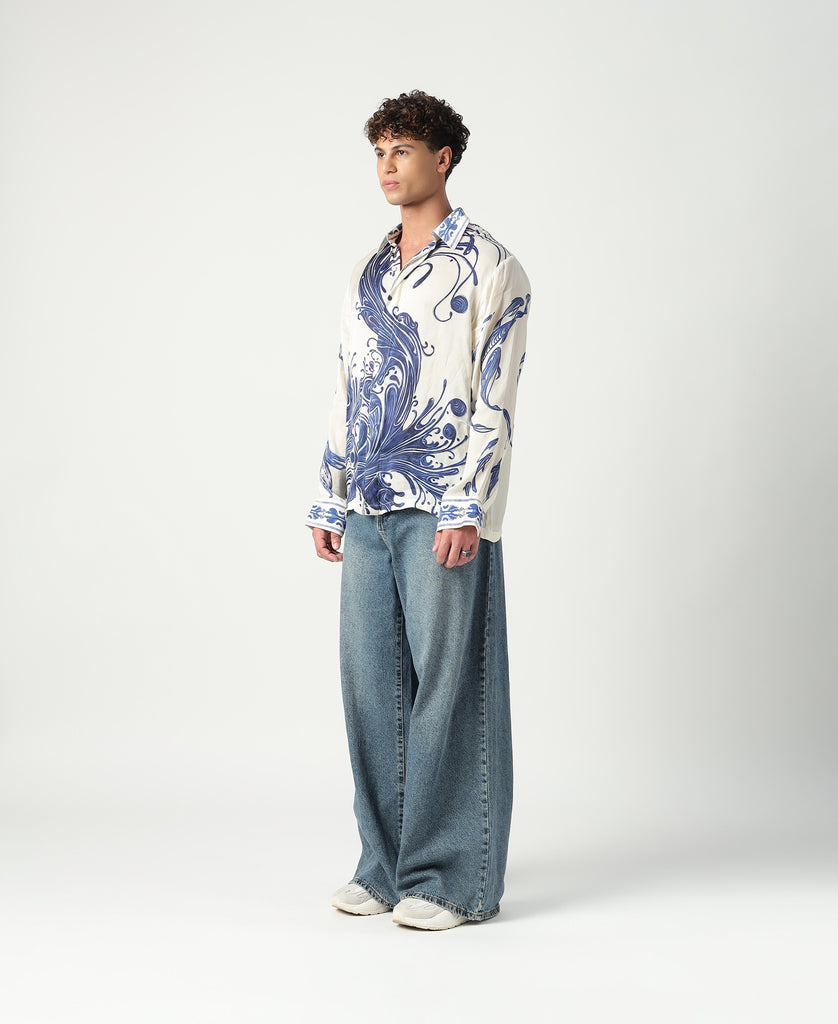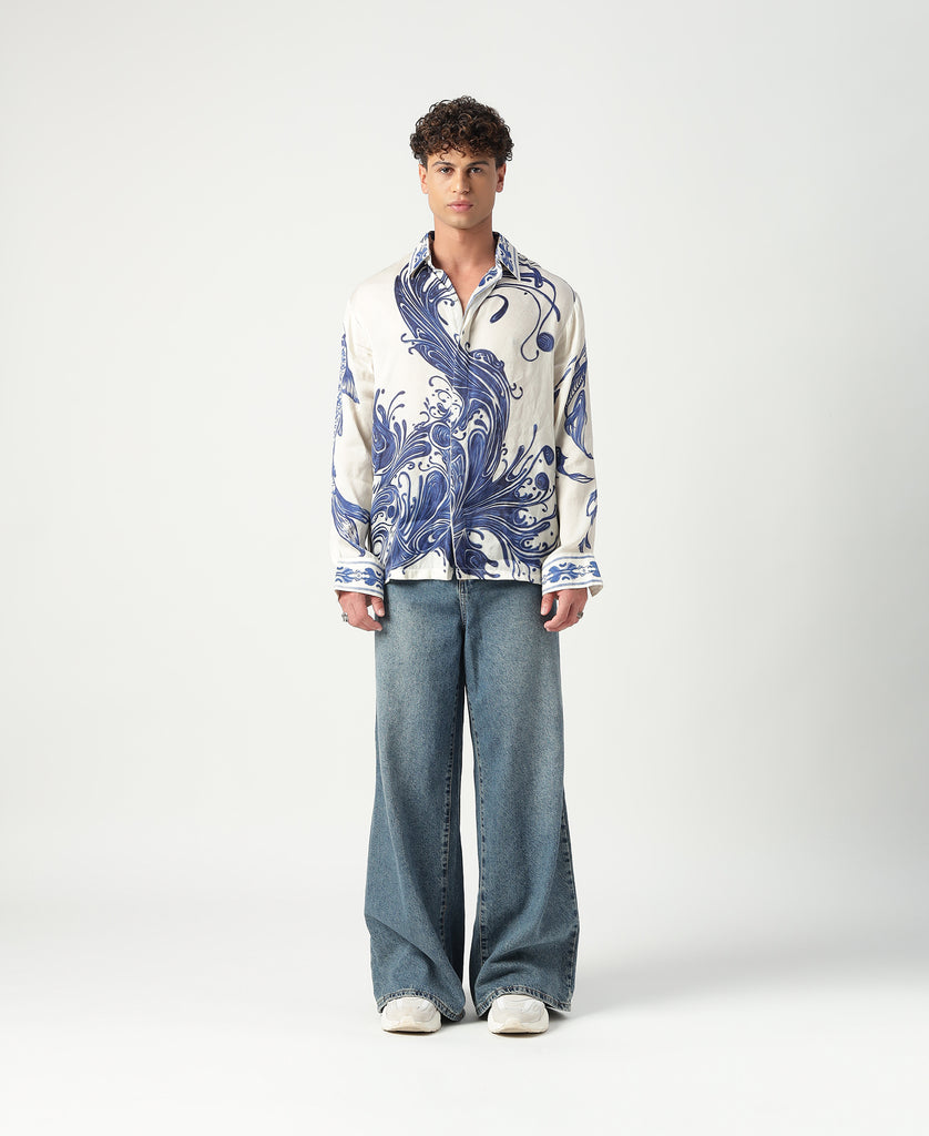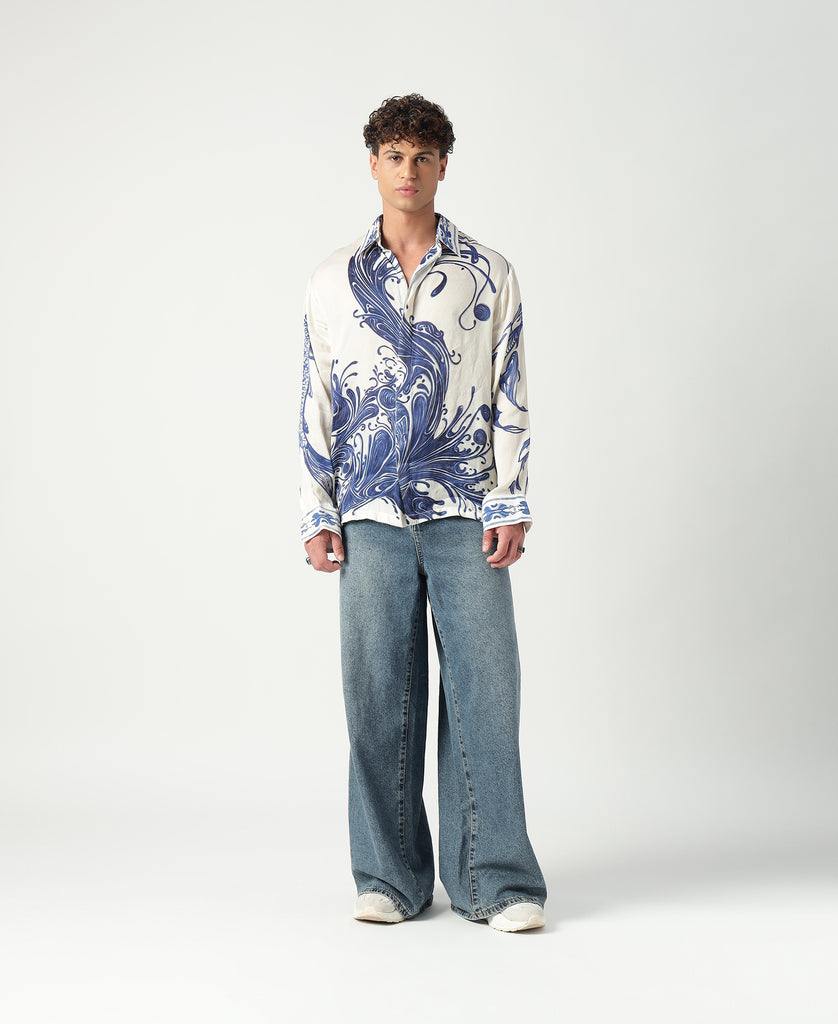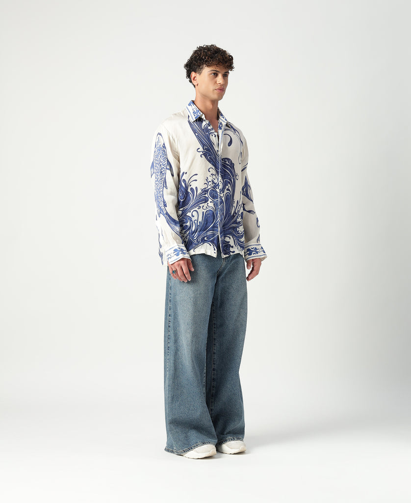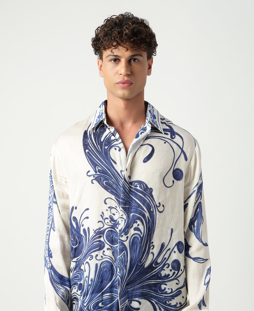 Introducing a full-sleeve engineered print satin shirt in ecru Color , inspired by the beauty of marine life. Featuring a classic collar and shell button closure, this shirt seamlessly blends luxury with artistry. The fish abstract add a unique touch, making it perfect for both casual and semi-formal occasions.